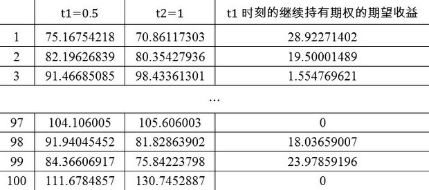 假设一个简单的美式看跌期权,其中标的的初始价格与行权价格均为100,无风险利率为1.5%,年化波动率为20%,期权续存期长度为1年。设相等时间间隔的两个行权时间点t1和t2,显然t1=0.5,t2=1。对标的价格进行100次模拟,得出两个时间点上标的的模拟价格,并求出期权期末行权的收益折算到t1时刻的数值,作为t1时刻的继续持有期权的期望收益。