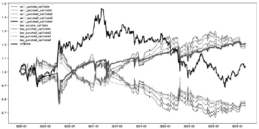 分析策略交易原理和理解跨式组合的损益结构 本文主要介绍勒式组合期权策略在沪深300指数中的应用情况,并对股指期权主力合约进行回测,对比买入勒式组合与卖出勒式组合策略,分析策略交易原理和理解跨式组合的损益结构。为进一步提升卖出勒式组合策略绩效,分别对止损和对冲两种方式进行初步探究。在大多数行情里,股指运行幅度不大,高波动趋势性行情较少。随着交易时间不断延长,期权时间价值的累计贡献度不断提升。买入勒式组合,长期持有亏损时间价值。反之,长期静态持有卖出勒式组合通过时间价值损耗获得稳定收益。但在持续性趋势行情下,卖出勒式组合应采取适当的风险管理,减少方向性亏损。 [勒式组合期权策略] 勒式组合(期权)由一份虚值看涨期权和一份相同到期日的虚值看跌期权构成,可以分为买入勒式组合和卖出勒式组合。跨式组合(期权)则由相同行权价和相同到期日的看涨期权和看跌期权构成。 当投资者预期标的资产价格变动幅度较大时,可以买入勒式组合;若标的资产价格向任一方向变动超过一定范围时,投资者可以获取收益。买入勒式组合风险有限,最大亏损为期初支付的权利金,向下盈亏平衡点=低的行权价格-权利金;向上盈亏平衡点=高的行权价格+权利金。 反之,当投资者预期标的资产价格变动幅度有限时,可以卖出勒式组合;若标的资产价格变动在一定范围内时,投资者可以获取收益,最大收益为卖出两份期权所获得的权利金。卖出勒式期权组合风险巨大,当标的资产向任一方向大幅变动时,策略损失较大;向下盈亏平衡点=低的行权价格-权利金;向上盈亏平衡点=高的行权价格+权利金。 [勒式组合期权策略在沪深300指数中的应用] 买入勒式组合与卖出勒式组合 根据不同的行权价格划分,选择不同档位的期权合约构建勒式组合。本文通过回测探究勒式组合在沪深300指数中的应用情况。 回测时间为2019年12月23日至2023年2月10日。回测设定本金100万元,回测对象为沪深300股指期权主力合约,持仓3组(即3手看涨期权和3手看跌期权),组合构建选取平值(跨式)、虚值一档、二档、三档和四档。比如买入勒式组合(虚值一档),即以buy_callotm1_putotm1表示。交易成本中,手续费为30元/手,滑点0.4点(2个tick),收益方式以收盘价计算。 策略A:以股指期权主力合约为交易对象,期权合约到期后换下一个主力合约继续开仓交易。通过对比买入勒式组合和卖出勒式组合,买入勒式组合长期静态持有是亏损的。卖出勒式组合获得年化收益率超6%,其中卖出虚值四档勒式组合年化收益率6.84%,最大回撤18.68%,夏普比率0.2715。长期静态持有卖出勒式组合通过时间价值损耗获得稳定收益。 静态持有卖出勒式组合在市场发生大趋势下具有较大的风险,可以看到在2020年7月股指快速上行阶段,卖出勒式组合回撤较大。卖出勒式组合在持续性趋势行情下,应该采取适当的风险管理,减少方向性亏损。