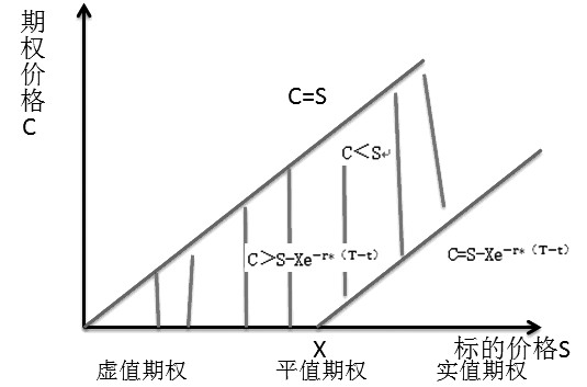 下图中,在行权价X左边S<X,对应的是虚值期权,而右边则相反。C=S为期权的上界,对于虚值期权,C=0为期权下边界,对于实值期权,C=S-Xe-r×(T-t)为期权下边界,上下边界之内为看涨期权价格合理区域,区域外即为无风险套利区域。