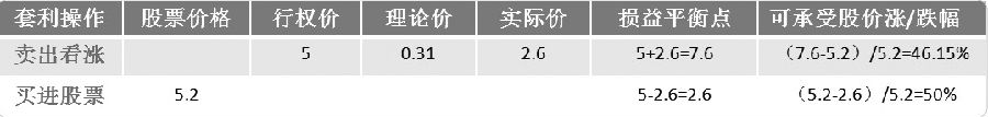 接着文中股票的例子,行权价为5元的看涨期权,假如报价为上边界5.2元的一半2.6元,倒推出来测算的隐含波动率就已经达到248%左右,这么高的隐含波动率就跟股票的超高市盈率一样存在极度溢价。一旦市场上真的有这种高溢价的情况出现,我们就可以进行套利操作。下面的表、图是进行具体卖出看涨备兑策略的情况。从表中的计算中可以看出,对于卖出看涨期权或是买进股票,除非在到期内股价发生超过50%左右的涨跌,卖出看涨期权者才会有损失的风险。再从合成后的损益图中可以看出,只要买进的股票在105天内不跌到2.6以下,卖出该看涨期权者都是有利可图的。当股票涨到5元以上,卖权者会被行权而以5元的价格交出股票,得到收益2.4元,而这个收益也是这个套利策略的最高收益。