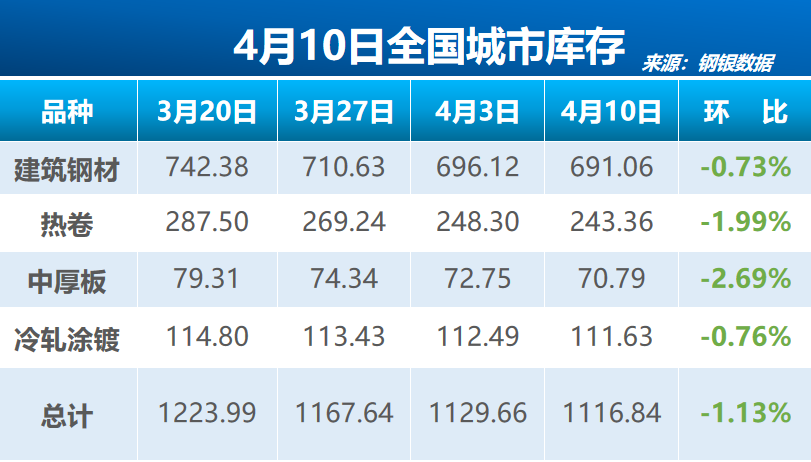 据钢银电商数据显示,截至4月10日,全国钢市总库存量为1116.84万吨,较上周环比减少12.82万吨(-1.13%),包含39个城市,共计146个仓库。 本周建筑钢材库存总量为691.06万吨,较上周环比减少5.06万吨(-0.73%),包含30个城市,共计85个仓库。 本周热卷库存总量为243.36万吨,较上周环比减少4.94万吨(-1.99%),包含16个城市,共计50个仓库。 本周中厚板库存总量为70.79万吨,较上周环比减少1.96万吨(-2.69%),包含9个城市,共计15个仓库。 本周冷轧涂镀库存总量为111.63万吨,较上周环比减少0.86万吨(-0.76%),包含6个城市,共计15个仓库。 ![]() (文章来源:新华财经) (责任编辑:admin) |