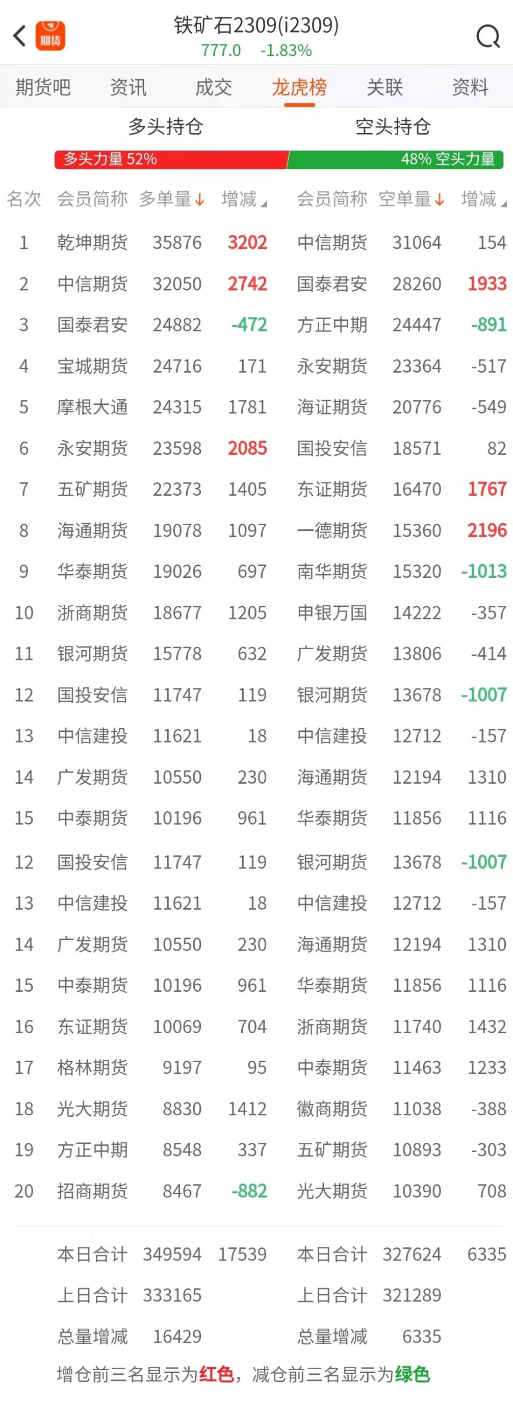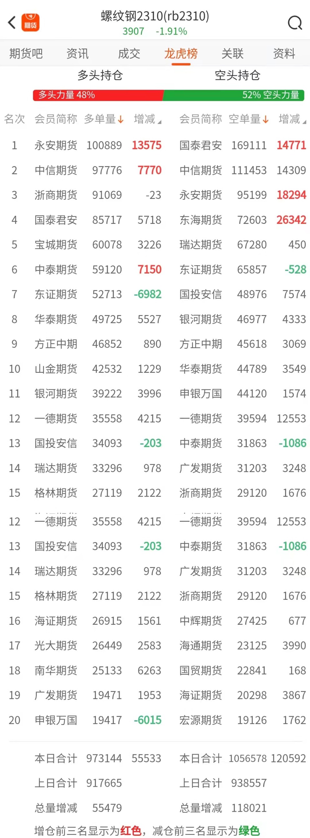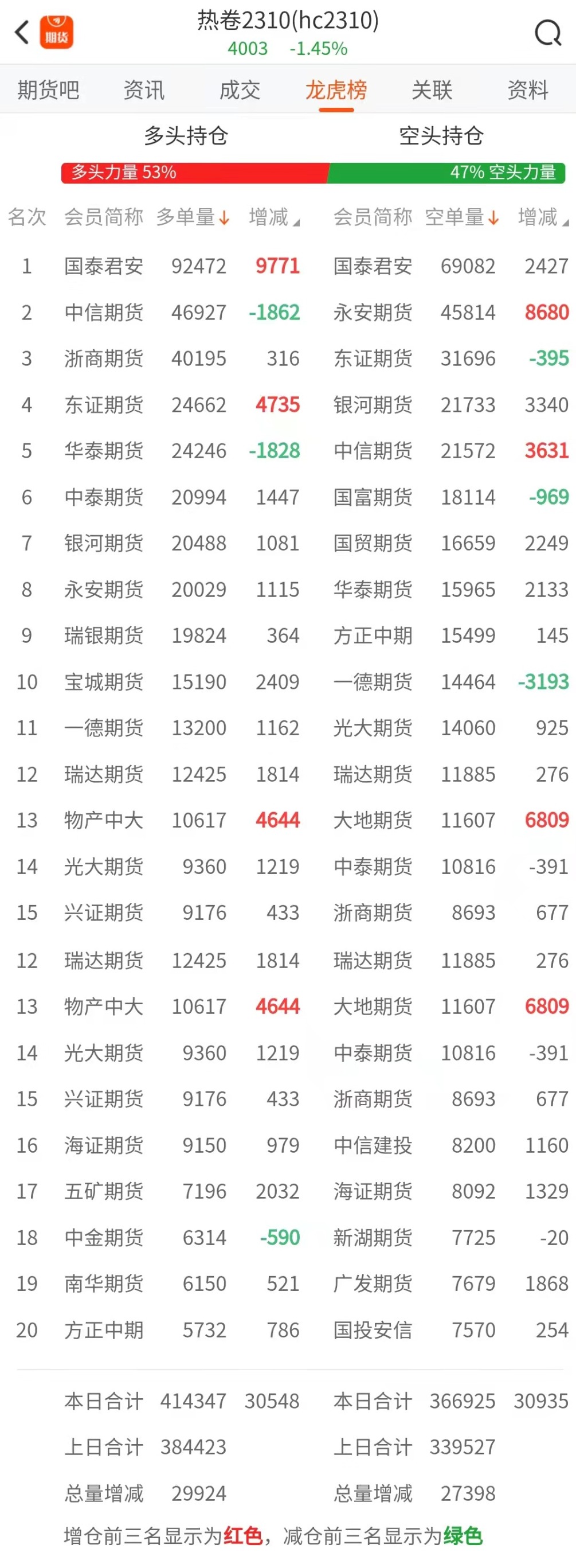截至4月10日收盘,螺纹钢2310收3907/吨,跌1.91%;热卷2310收4003/吨,跌1.45%;铁矿石2309收777元/吨,跌1.83%;焦炭2305收2490.5/吨,跌1.93%;焦煤2305收1696.5元/吨,跌3.66%。 螺纹钢2310合约前20席位多单增仓55533手至97.3万余手,空单增仓120592手至105.6万余手。其中,永安期货多单增持13575手,空单增持18294手,整体呈净多5690手。 各品种具体如下: ![]() 各品种持仓情况具体如下: ![]() ![]() ![]() ![]() ![]() 注:可通过点击东方财富期货PC端左侧“龙虎榜”栏目及东方财富期货APP行情页面“龙虎榜”栏目查看各类机构持仓及盈亏榜单信息。 ![]() ![]() (文章来源:东方财富研究中心) (责任编辑:admin) |