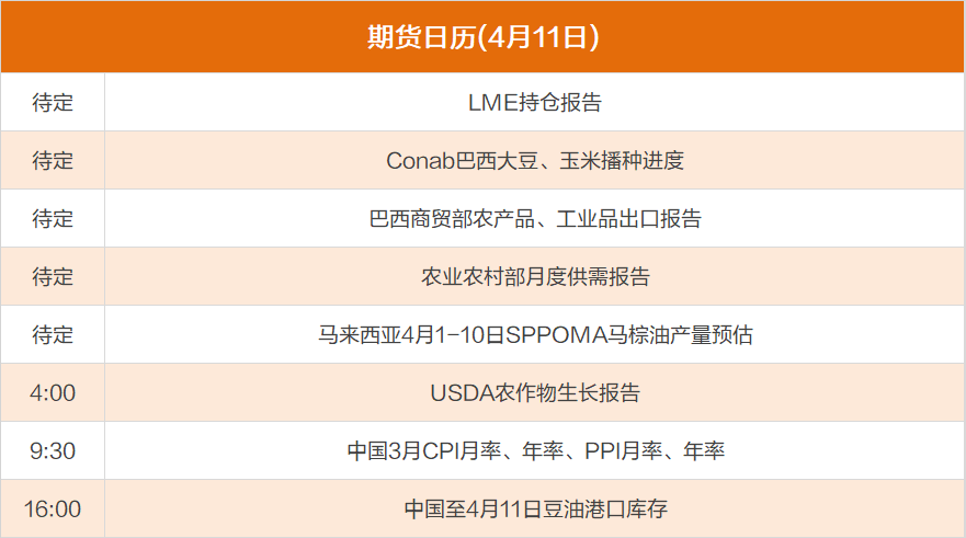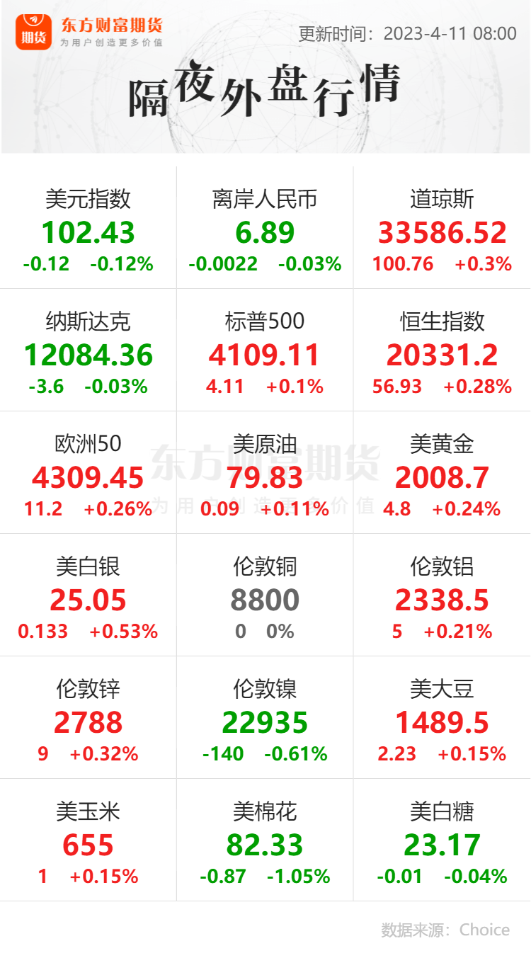 外盘收报![]() 每日精选加不加息CPI说了算?本周又到了华尔街“押宝”通胀数据的时刻 中小银行密集下调存款 挂牌利率会有全面性调整吗? 大商所调整多个期货品种交易保证金比例和涨跌停板幅度 宏观产经国家卫健委:现阶段我国疫苗接种的重点是针对不同目标人群补齐免疫水平差距,进一步降低重症和死亡风险。目标人群主要包括:(一)未感染且未完成既定免疫程序的人群。包括3-17岁未感染且尚未完成基础免疫的人群,18岁以上未感染且尚未完成第一剂次加强免疫的人群,以及18岁以上未感染且尚未完成第二剂次加强免疫接种的人群(感染高风险人群、60岁以上老年人群、具有较严重基础性疾病人群和免疫力低下人群)。(二)已感染且未完成基础免疫的人群。 乘联会:2023年3月乘用车市场零售达到158.7万辆,同比增长0.3%,环比增长14.3%。3月零售环比实现14.3%的正增长,是本世纪以来最弱的3月环比增速。3月新能源乘用车批发销量达到61.7万辆,同比增长35.2%,环比增长24.5%;1-3月新能源乘用车批发销量达到150.1万辆,同比增长25.8%。 大商所:自2023年4月12日结算时起,对相关期货合约的涨跌停板幅度和交易保证金水平做如下调整:棕榈油、乙二醇、苯乙烯和液化石油气期货合约涨跌停板幅度调整为7%,交易保证金水平调整为8%;豆粕、豆油、聚乙烯、聚丙烯、聚氯乙烯期货合约涨跌停板幅度调整为6%,交易保证金水平调整为7%。 品种资讯黑色系&金属期货 螺纹钢:国家发改委价格成本调查中心消息,为深入了解“双碳”目标下我国钢铁行业实施碳减排的成本费用情况,并就面临的成本挑战等相关问题听取意见及建议,为钢铁行业绿色、低碳发展研究提供参考,2023年4月4日,国家发展改革委价格成本调查中心赴河钢集团石钢公司开展调研。河北省发展改革委、冶金工业经济发展研究中心及中心综合信息处有关同志参与此次调研。(界面新闻) 铁矿石:4月3日-4月9日,中国47港铁矿石到港总量2321.3万吨,环比减少50.2万吨;中国45港铁矿石到港总量2269.4万吨,环比增加12.7万吨;北方六港铁矿石到港总量为1177.8万吨,环比增加81.5万吨。 4月3日-4月9日,澳洲巴西19港铁矿发运总量2352.1万吨,环比减少309.7万吨。澳洲发运量1831.5万吨,环比减少111.2万吨,其中澳洲发往中国的量1525.5万吨,环比减少105.4万吨。巴西发运量520.6万吨,环比减少198.5万吨。(Mysteel) 焦炭:今日国内焦炭市场弱势下调。随着华东、华北主流钢厂对焦炭采购价格提降50-100元/吨,焦炭第二轮提降全面落地执行,截止目前累降100-200元/吨。综合来看,随着钢材价格继续下跌,钢厂利润欠佳,多控制焦炭到货情况,打压焦价意愿继续增强,加之中间投机贸易商离市观望,影响产地焦企出货放缓,厂内焦炭库存有不同程度累积,叠加焦炭成本支撑走弱,预计短期内焦炭市场或继续偏弱运行。(焦联网) 镍:据调研统计,2023年3月中国&印尼镍生铁实际产量金属量总计14.88万吨,环比增加6.46%,同比增加20.23%。中高镍生铁产量12.40万吨,环比增加11.3%,同比增加15.86%。其中,3月中国镍生铁实际产量金属量2.98万吨,环比减少11.27%,同比减少18.45%。中高镍生铁产量2.41万吨,环比减少14.03%,同比减少19.43%;低镍生铁产量0.56万吨,环比减少13.82%,同比增加52.14%。(Mysteel) 工业硅:随着硅价进一步下跌,硅厂成本倒挂情况严重,这在一定程度上打击了企业的生产积极性,多数硅企均存在停产情况。(期货日报) 农产品期货 棕榈油:4月10日马来西亚棕榈油局MPOB公布3月供需报告,其中3月棕榈油库存量为1673044吨,环比减少21.08%,低于彭博预期的175万吨和路透预期的177万吨。 据马来西亚独立检验机构AmSpec,预计马来西亚4月1-10日棕榈油出口量为337233吨,3月1-10日为474830吨,环比减少28.98%。据船运调查机构ITS数据显示,马来西亚4月1-10日棕榈油出口量为322985吨,上月同期为501514吨,环比减少35.60%。(新华财经) 生猪:目前已有多地将加强非洲猪瘟病毒的检测作为防控工作的主要抓手。4月6日,苍南县农业农村局畜牧兽医中心组织有关人员到苍南县威农畜牧养殖有限公司开展无非洲猪瘟小区维持无疫巡查指导工作。在福建尤溪县,该县农业农村局根据国家、省、市相关文件要求,结合本地实际,制定非洲猪瘟年度监测计划,明确工作进度,积极开展非洲猪瘟监测工作。山东烟台市莱山区则通过落实生猪屠宰环节非洲猪瘟自检和官方兽医派驻两项制度做好非洲猪瘟防控。(澎湃新闻) 据国家发改委数据,截至4月5日,全国生猪出场价格为14.78元/公斤,比3月29日下跌2.31%;猪粮比价为5.17,比3月29日下跌0.96%。(发改委网站) 豆粕:据我的钢铁(Mysteel)统计,4月10日全国主要油厂豆粕成交20.16万吨,较上一交易日增加14.02万吨,其中现货成交20.16万吨,远月基差成交0万吨。当日全国123家油厂开机率上升至43.09%。(新华财经) 棉花:生意社数据显示,截至10日3128级皮棉价格在15459元/吨,周环比上涨1.04%,本周棉花现货市场报价上涨,棉企积极性较好,成交继续以小批量为主。生意社认为,国内需求的季节性转弱,纺织厂开工率有所下降,多地反映需求有转弱迹象,后续订单增长乏力。短期来看,新年度植棉面积利好支撑,棉价仍有震荡向上的动力,中长期来看,下游即将进入行业淡季,需求拖累棉价上涨空间有限。(证券时报网) 能化期货 天然气:4月6日,国家能源局在江苏常州组织召开2023年全国油气管道规划建设和保护工作会议,会议强调,要全