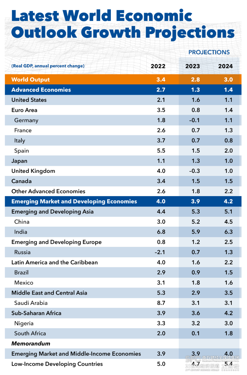 当地时间4月11日,国际货币基金组织(IMF)发布最新一期《世界经济展望》(以下简称《展望》)警告,在通胀居高不下、金融部门出现动荡的背景下,全球经济可能实现软着陆(通胀下降和增长稳定)的初步迹象已经消退,硬着陆的可能性正急剧上升。 根据该机构的预测,今明两年,全球经济增速将分别达到2.8%、3%,这比该机构三个月前的预测分别低0.1个百分点;全球通货膨胀率将从去年的8.7%下降到今年的7%、明年的4.9%,下降的速度要慢于此前预期。 IMF总裁格奥尔基耶娃在世界银行和IMF春季会议周拉开帷幕时说,过去三年,全球经济翻过了一座又一座“险峰”,但却发现前方还有更多的崇山峻岭:首先是新冠疫情,接着是俄乌冲突,之后是通货膨胀。当前,“恢复稳健增长之路仍崎岖不平、迷雾重重”。 首先,全球经济增长仍然动力不足。与过去水平相比,经济增长无论从短期还是中期看都将持续疲软。根据IMF的预测,未来五年全球经济增速将保持在3%左右,这是该机构自1990年以来作出的最低中期经济增速预测,远低于过去二十年3.8%的平均水平。 《展望》显示,今年的经济放缓主要集中在发达经济体,约有90%发达经济体的经济增速将出现下滑,尤其是欧元区和英国,它们今年的预期增速将分别降至0.8%和-0.3%,明年将分别反弹至1.4%和1%。美国今年的增速预期将降至1.6%,明年进一步放缓至1.1%。 相比之下,尽管被下调了0.5个百分点,但许多新兴市场和发展中经济体正在回暖,今年四季度预期增速将从去年的2.8%提高到今年的4.5%。其中,中国和印度的增长势头依然强劲,今年全年增速预期分别为5.2%和5.9%,两国将贡献全球经济增长的一半。 但令人担心的是,低收入国家将遭受多重打击,不仅其出口需求受发达国家经济疲弱拖累,其借贷成本也因欧美加息而上升。IMF警告,低收入国家的人均收入增速始终低于新兴经济体,这使它们实现收入趋同的难度进一步增加。另外,它们面临的贫困和饥饿问题也可能进一步加剧。 其次,欧美银行业危机揭示金融风险上升。“近期银行业出现的动荡提醒我们,形势依然脆弱。下行风险再次占据主导地位,世界经济前景的迷雾更加浓厚。”IMF首席经济学家皮埃尔-奥利维耶·古兰沙在发布会上说道。 当前,硅谷银行事件造成的影响仍然在蔓延。在截至3月29日的前两周时间里,美国商业银行的季调后贷款规模骤降近1050亿美元,这也是该数据从1973年开始统计以来的极值。古兰沙警告,若银行进一步削减放贷规模,今年全球经济增速可能再降低0.3个百分点。 然而,这还不是最坏的情况。他表示,若全球金融状况急剧收紧,即所谓的“避险”事件,可能会对信贷状况和公共财政产生巨大影响,尤其是在新兴市场和发展中经济体,会导致大量资本外流,风险溢价突然上升,美元升值成为避险港湾,以及全球经济活动因信心下降、家庭支出和投资下滑而大幅萎缩。 在如此严重的下行情景下,《展望》显示,今年全球增长可能放缓至1%,这意味着人均收入接近停滞。按照该机构的估算,出现这种结果的概率约为15%。 最后,全球通胀回落速度慢于预期。“通货膨胀比几个月前预期的要棘手得多。虽然全球通胀有所下降,但这主要反映了能源和食品价格的急剧逆转。在许多国家,不包括能源和食品在内的核心通胀尚未见顶。”古兰沙说道。 根据IMF的预测,今年底核心通胀率将放缓至5.1%,比1月时的预测大幅上调0.6个百分点,并远高于目标。 中国经济强劲复苏为全球注入动力 全球经济并非只有坏消息,中国经济的强劲反弹正在为全球提供动力。根据IMF的最新预测,中国今明两年的经济增速将分别达到5.2%和4.5%,跟该机构3个月前的预测持平。 “中国经济的强劲反弹意味着其将在2023年贡献全球经济增长的约三分之一,这将为世界经济带来可喜的拉动作用。”3月底,格奥尔基耶娃在北京参加中国发展高层论坛2023年年会时说道。 她表示,除了直接促进全球经济增长以外,IMF的分析还显示:中国的GDP增速每提高1个百分点,就会使其他亚洲经济体的平均GDP增速提高0.3个百分点——这种提振令人欣喜。 ING银行大中华区首席经济学家彭蔼娆在接受21世纪经济报道记者采访时表示,中国的复苏之路不只限于今年,应该会持续3到5年,今年是整个复苏的起点。在今年全年,第一季度的复苏也只是一个开始。除了关注GDP增速外,当前,还应该抓紧机会推动高质量增长。 彭蔼娆认为,当前,通胀在中国还很温和。“经济复苏刚开始不久,各个商家面对激烈的竞争,注意力都在怎么把量做上去,为了抢占市场规模,不会轻易抬价,这使得物价没有快速上升。” 景顺首席全球市场策略师Kristina Hooper认为,有迹象表明中国及时调整防疫政策对国内经济产生了积极影响,尤其是服务业。此外,政策制定者已表示将支持平台经济,而且承诺会保护私营企业及企业家权利,并推出更加有效及积极的财政政策。因此,中国今年设定的“约5%”的GDP增长目标相对容易实现。 景顺亚太区(日本除外)全球市场策略师赵耀庭表示,中国银行业是最不受这场小型银行业危机影响的,因为中国央行并未加息,所以不会面临资本外流。相反,在过去疫情带来的经济不确定性之下,家庭超额储蓄不断累积,过去一年中国银行业的存款量显著增长。 他进一步表示,在中国及时调整防疫政策后,中国的经济前景越发光明。当前,中国国内通胀压力可控,一年期
