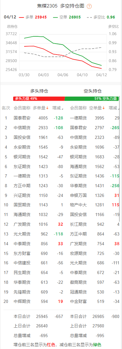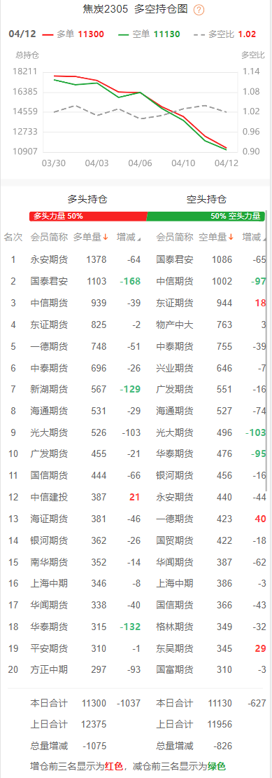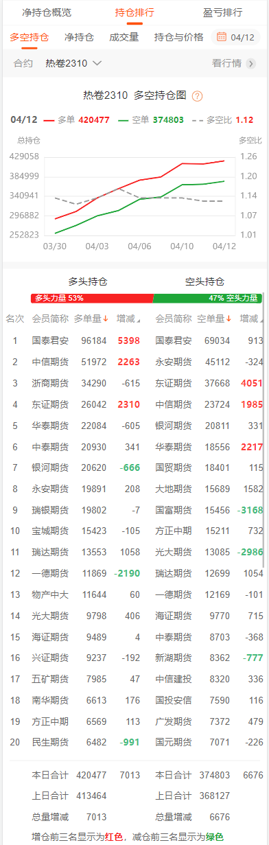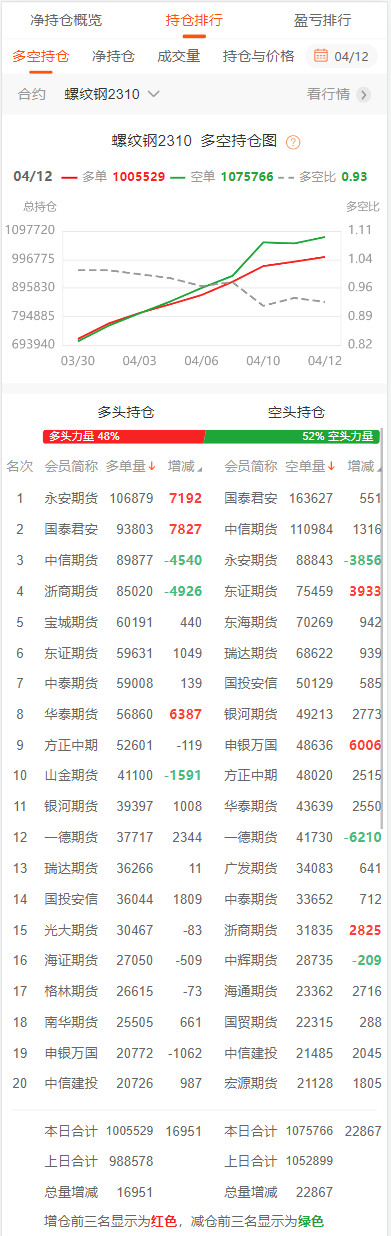 截至4月12日收盘,螺纹钢2310收3900/吨,跌0.08%;热卷2310收3997/吨,跌0.03%;铁矿石2309收788元/吨,涨0.25%;焦炭2305收2527.5/吨,涨0.84%;焦煤2305收1725元/吨,涨0.91%。 螺纹钢2310合约前20席位多单增仓16951手至100.5万余手,空单增仓22867手至107.5万余手。其中,国泰君安期货多单增持7827手,空单增持551手,整体呈净空69824手。 各品种具体如下: ![]() 各品种持仓情况具体如下: ![]() ![]() ![]() ![]() ![]() 注:可通过点击东方财富期货PC端左侧“龙虎榜”栏目及东方财富期货APP行情页面“龙虎榜”栏目查看各类机构持仓及盈亏榜单信息。 ![]() ![]() (文章来源:东方财富研究中心) (责任编辑:admin) |