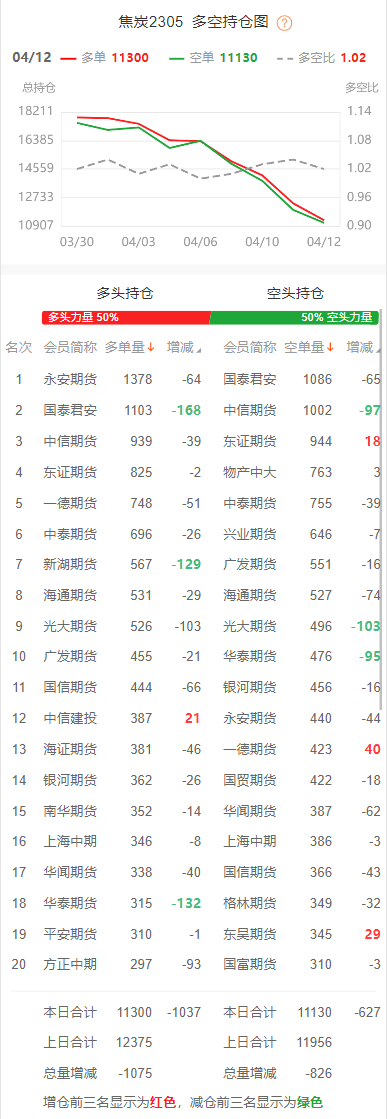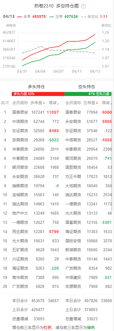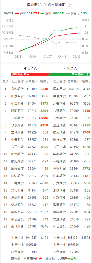 截至4月13日收盘,螺纹钢2310收3886/吨,跌0.72%;热卷2310收3957/吨,跌1.35%;铁矿石2309收769元/吨,跌3.09%;焦炭2305收2533/吨,涨0.44%;焦煤2305收1726元/吨,涨0.35%。 螺纹钢2310合约前20席位多单增仓6198手至101.1万余手,空单增仓14803手至108.8万余手。其中,东证期货多单增持13886手,空单增持4450手,整体呈净空6392手。 各品种具体如下: ![]() 各品种持仓情况具体如下: ![]() ![]() ![]() ![]() ![]() 注:可通过点击东方财富期货PC端左侧“龙虎榜”栏目及东方财富期货APP行情页面“龙虎榜”栏目查看各类机构持仓及盈亏榜单信息。 ![]() ![]() (文章来源:东方财富研究中心) (责任编辑:admin) |