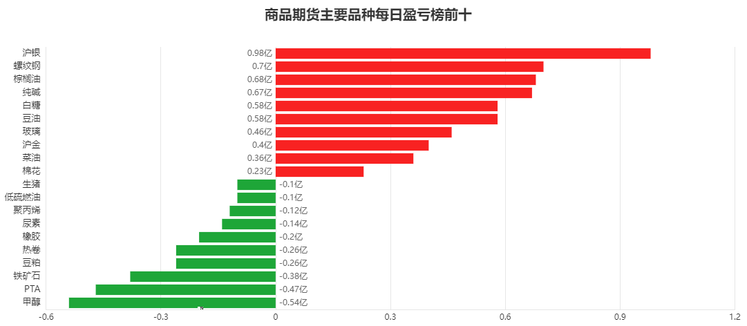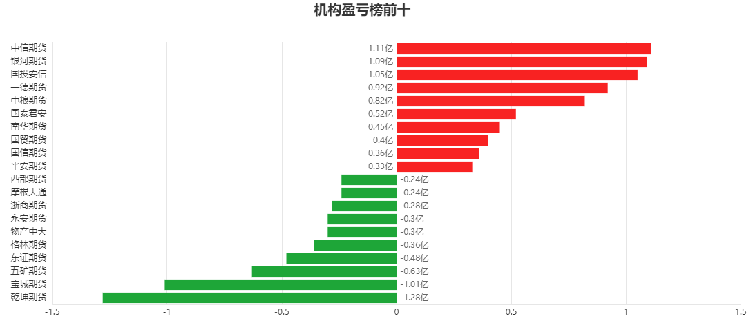 品种盈亏榜:今日商品期货中沪银盈利第一,为0.98亿元。 甲醇亏损第一,为0.54亿元。 ![]() 就沪银而言,今日席位盈利前三为华泰期货、广发期货、国投安信,分别盈利2548.88万元、1503.48万元、1422.51万元。 今日席位亏损前三为国贸期货、东证期货、海证期货,分别亏损949.06万元、907.75万元、894.14万元。 ![]() 就甲醇而言,今日席位盈利前三为平安期货、浙商期货、徽商期货,分别盈利917.29万元、691.91万元、680.58万元。 今日席位亏损前三为国泰君安、中信期货、东证期货,分别亏损2786.29万元、2050.29万元、1834.83万元。 ![]() 席位盈亏榜:今日机构席位中中信期货盈利第一,为1.11亿元。 乾坤期货亏损第一,为1.28亿元。 ![]() 就中信期货而言,今日品种盈利前三为棕榈油、PVC、螺纹钢,分别盈利2262.40万元、2027.27万元、1979.70万元。 今日品种亏损前三为甲醇、热卷、铁矿石,分别亏损2050.29万元、1175.06万元、805.67万元。 ![]() 就乾坤期货而言,今日品种盈利前三为豆油、棕榈油、菜油,分别盈利1416.71万元、909.99万元、561.27万元。 今日品种亏损前三为铁矿石、PTA、菜粕,分别亏损10262.39万元、5018.99万元、755.82万元。 ![]() 注:可通过点击东方财富期货PC端左侧“龙虎榜”栏目及东方财富期货APP行情页面“龙虎榜”栏目查看各类机构持仓及盈亏榜单信息。 ![]() ![]() (文章来源:东方财富研究中心) (责任编辑:admin) |
