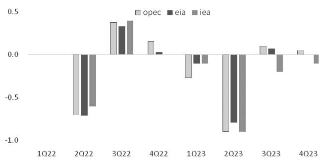 图为美国原油年内增产速度(千桶/日) D关注美联储政策变化 宏观利空对油价的压制仍然不可忽视。 2022年3月,美联储时隔两年后展开加息,正逢俄乌冲突初期,市场仍在交易地缘政治溢价,对商品影响有限。6月起,美联储政策调控更加激进,将加息幅度扩大至75BP,全球商品市场随即展开一轮大幅调整,截至9月末,油价最大区间跌幅超过30%。美联储加息持续施压消费端,且效果明显。 3月23日,美联储议息会议提及2023年年底利率预期中值为5.1%,且表示降息不是今年的基本预期,表明3月后美国加息空间已较为有限,整体来看本轮加息周期进入尾声,5月或是美联储本轮最后一次加息。值得注意的是,本次OPEC+超预期减产带动油价中枢上行,可能再度加剧美国通胀压力,进而使得美联储对货币政策进行重新调整,不排除后期加息幅度超预期的可能性。截至4月11日,CME美联储观察数据显示,5月维持利率不变的概率下降至32.6%,加息25个基点至5.00%—5.25%区间的概率为67.4%。在美联储本轮加息周期结束前,宏观环境对原油市场的压力仍不可忽视。 E价格中枢或继续上移 2023年原油需求将继续回升,受到经济前景不明朗的拖累,增速可能有所放缓。但考虑到OPEC的超预期减产以及需求季节性回升,从二季度起,原油市场或逐步转为去库格局。 IEA预计2023年全球油品需求同比增长2%,增速较2022年下降了0.4个百分点。分油品来看,预计同比需求增长最大的依然是航煤,主要是基数较低所致。航煤需求有望从2022年的615万桶/日增长至731.5万桶/日,预计2023年四季度航煤需求有望恢复至2019年的95%,需求同比增长19%,也是唯一增速超过10%的油品。柴油受到经济前景不明朗以及高价的抑制,预计2023年需求基本没有增长。分地区来看,IEA预计2023年全球油品消费增量主要集中在亚太,预计增速4.3%,增量156万桶/日,其中我国将贡献近一半增量,而其余地区基本没有增长,俄罗斯预计消费将同比回落5.8万桶/日。 2023是全球炼油产能的投放大年,预计全球将净增加125万桶/日左右的炼油能力,较2022年增加超40%,将明显缓解全球范围内的成品油,特别是柴油短缺,预计后期柴油炼油利润中枢将继续向均值靠拢。 从供需平衡表来看,在本次OPEC+减产宣布前,上半年原油市场供应端仍较为充沛,预计二季度市场库存将继续增长,下半年有望逐步转为去库。但OPEC+本轮减产计划将带来100万桶/日以上的供应削减,上半年原油市场的供应过剩将得到显著改观,且OPEC+的减产可能使得东区原油供应更为紧张。去库行情有望在二季度提前落地,对油价产生支撑,但在宏观利空消化前,油价上方空间相对有限。下半年原油供应缺口在需求季节性旺季以及中国与欧美国际航线的复苏预期推动下有望继续放大,若届时宏观环境配合,油价中枢或进一步上行。