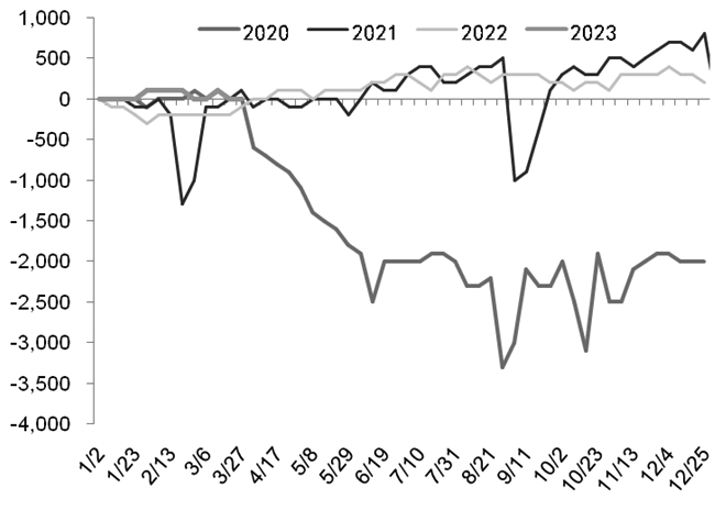 图为OPEC实际原油产量与配额(千桶/日) B俄罗斯供给边际回落 3月中旬,俄罗斯表示将把此前宣布的50万桶/日减产计划延长至6月底,此后又同OPEC其他成员国一起将减产延长至2023年年底。从季节性开工情况来看,每年一季度过后俄罗斯炼厂开工率逐步下滑,二季度一般为俄罗斯炼厂年内开工低点。4—5月炼厂输入量较1—2月约减少100万桶/日,3月开始减产能够一定程度上对冲炼厂原油输入量的下滑,同时减轻了原油出口压力。欧美对俄罗斯的海运制裁一定程度上影响其出口,但进一步下降空间有限。三大机构也在3月报中继续上调了俄罗斯石油供应预期。EIA预计俄罗斯2023年油品供应量均值约为1030万桶/日,较2个月前的预期上调接近80万桶/日。OPEC近两个月累计上调69万桶/日。IEA数据显示,俄罗斯2月油品出口环比下降50万桶/日,至750万桶/日。成品油方面,2月俄罗斯对欧洲出口同比减少170万桶/日,至25万桶/日。这部分出口量被转移至亚洲(31万桶/日)、非洲(25万桶/日)以及土耳其(23万桶/日)等地。IEA同样上调了俄罗斯2023年供应预期。3月初媒体报道称美国正敦促部分大型石油贸易商继续运输俄罗斯石油,且美国政府将提供必要的帮助。美国对俄罗斯石油制裁态度向来宽松。且在俄乌冲突开启后的一年多里,俄罗斯已经基本建立新的油品出口渠道,但考虑到运力以及保险仍将受到影响,我们预计俄罗斯石油供应将边际回落,但降幅有限。