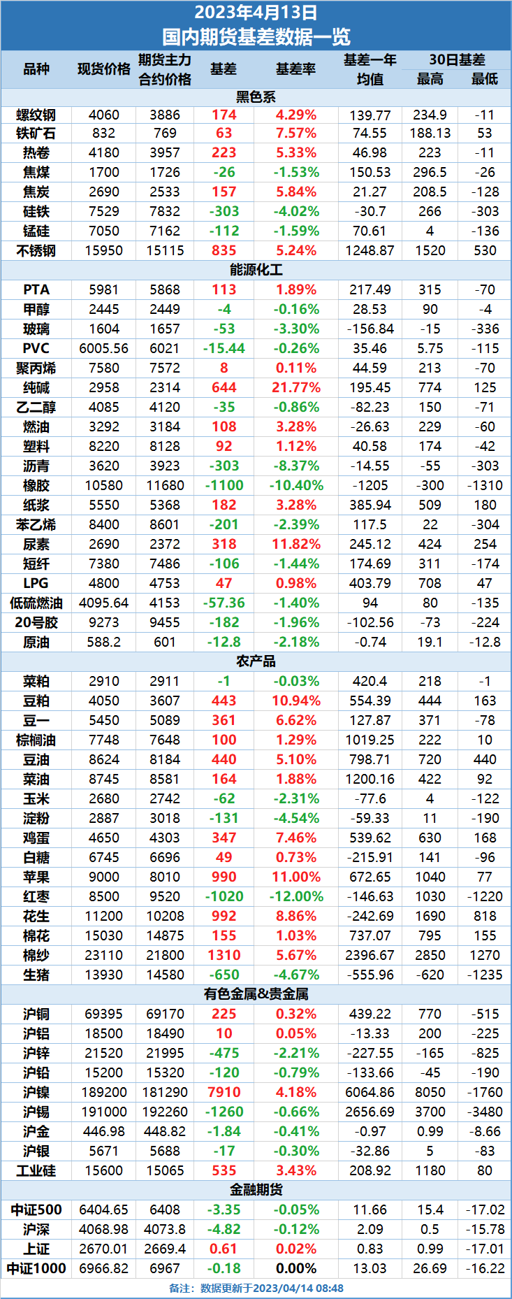 基差报告:4月13日国内期货基差数据一览