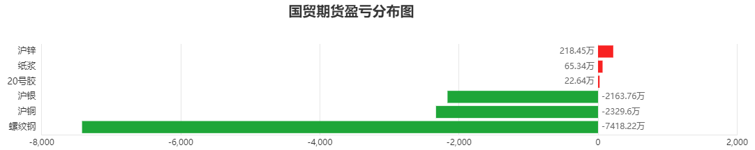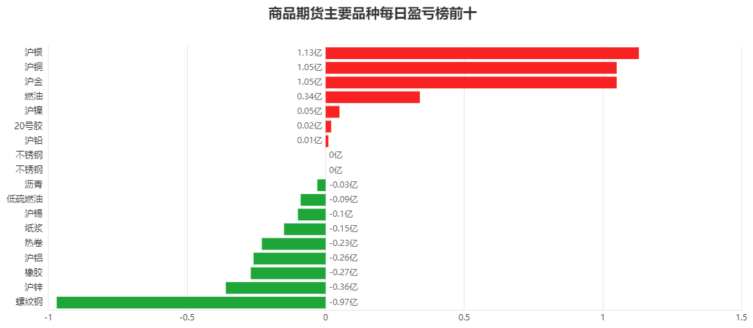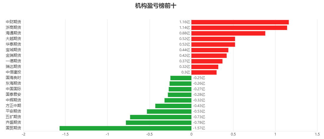 市场一览:周五商品期货综合指数上涨1.02%,日内资金净流入32.26亿元。 市场成交量为3057.68万手,成交额为1.87万亿元。 持仓量为3714.74万手,较前一交易日增加0.50万手。 市场成交量前十和持仓量前十如下图所示: ![]() ![]() ![]() 品种盈亏榜:今日商品期货中沪银盈利第一,为1.13亿元。 螺纹钢亏损第一,为0.97亿元。 ![]() 就沪银而言,今日席位盈利前三为华泰期货、国投安信、浙商期货,分别盈利5516.39万元、3322.16万元、3269.57万元。 今日席位亏损前三为国泰君安、方正中期、五矿期货,分别亏损4923.55万元、2301.65万元、2256.93万元。 ![]() 就螺纹钢而言,今日席位盈利前三为宝城期货、中泰期货、浙商期货,分别盈利2629.72万元、2331.47万元、1733.03万元。 今日席位亏损前三为国贸期货、国泰君安、东海期货,分别亏损7418.22万元、3758.77万元、2570.06万元。 ![]() 席位盈亏榜:今日机构席位中中财期货盈利第一,为1.16亿元。 国贸期货亏损第一,为1.57亿元。 ![]() 就中财期货而言,今日品种盈利前三为沪金、沪银、20号胶,分别盈利11528.87万元、260.71万元、4.33万元。 今日品种亏损前三为橡胶、热卷、沥青,分别亏损85.58万元、40.53万元、29.96万元。 ![]() 就国贸期货而言,今日品种盈利前三为沪锌、纸浆、20号胶,分别盈利218.45万元、65.34万元、22.64万元。 今日品种亏损前三为螺纹钢、沪铜、沪银,分别亏损7418.22万元、2329.60万元、2163.76万元。 ![]() 注:可通过点击东方财富期货PC端左侧“龙虎榜”栏目及东方财富期货APP行情页面“龙虎榜”栏目查看各类机构持仓及盈亏榜单信息。 ![]() ![]() (文章来源:东方财富研究中心) (责任编辑:admin) |