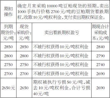以饲料企业为例,现货采购价格以期货盘面点价确定,采购豆粕时卖出虚值的期货看跌期权。假设豆粕期货价格是每吨2800元,企业一个月后有1万吨豆粕采购规划,采购价格是月底点价确定且价格预期看跌,同时又有饲料产品销售作为价格对冲。企业认为只要价格低于2700元/吨就愿意点价,所以可以卖出1000手执行价格为2700元/吨的一个月豆粕看跌期权,收取10元/吨的权利金。一个月到期,如果期货价格大于2800元/吨企业点价采购,但比期货盘面点价降低了10元/吨采购成本,给企业增加了10元/吨的利润空间。如果到期时期货价格在2700—2800元/吨期权不会被执行,企业点价采购就比一个月前提前按2800元/吨降低了采购成本,每吨降低的价格为:2800-点价时的期货价格+10元。如果价格低于2700元/吨,企业就只能按照2700元/吨采购,但采购价格相比于提前按2800元/吨采购降低了100元加10元共110元/吨。相对于市价虽有提高,但符合企业的采购意愿,达到了企业的采购要求。