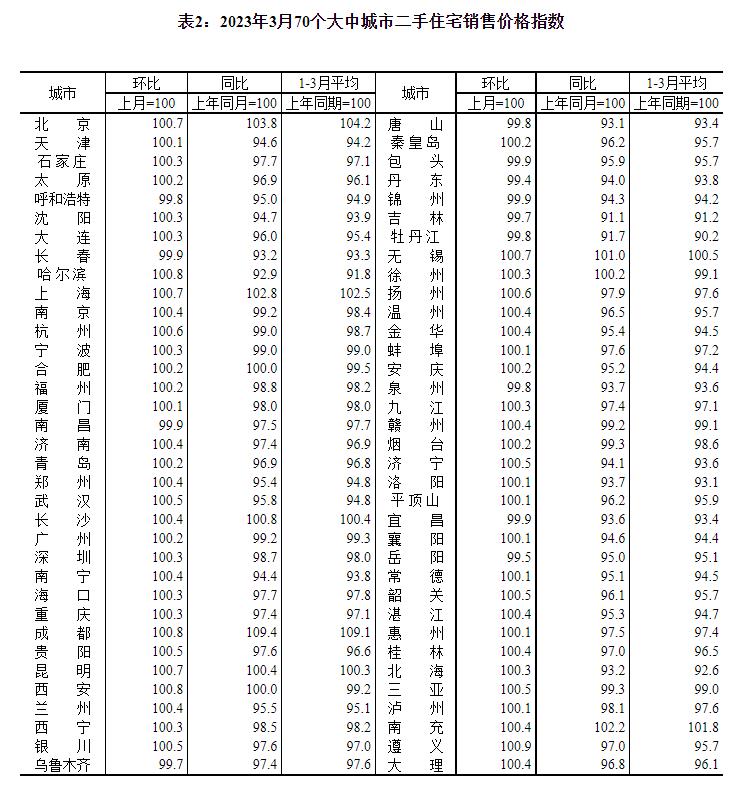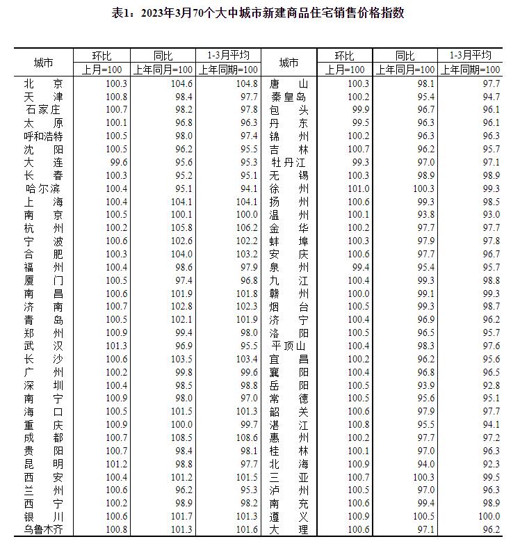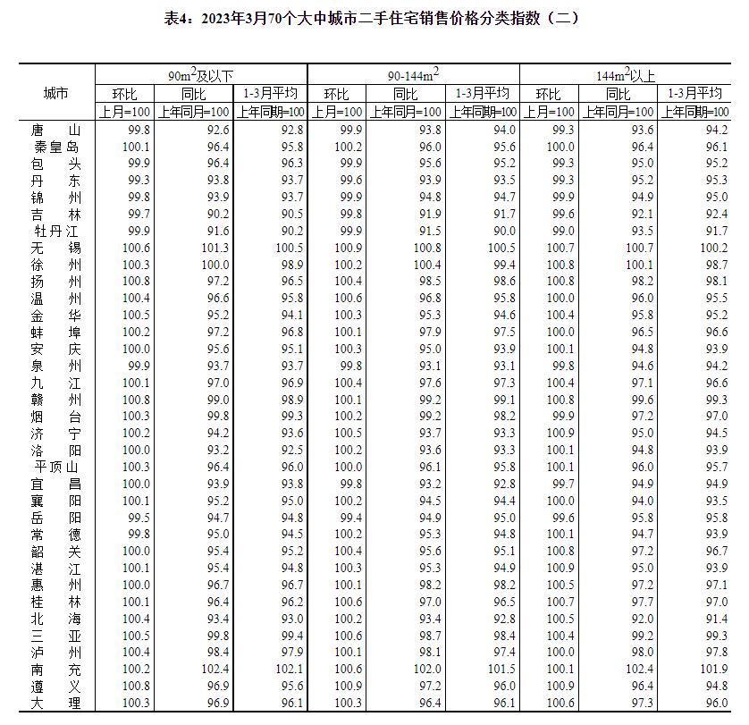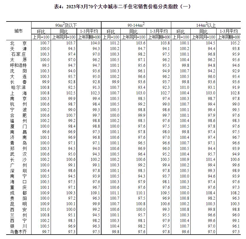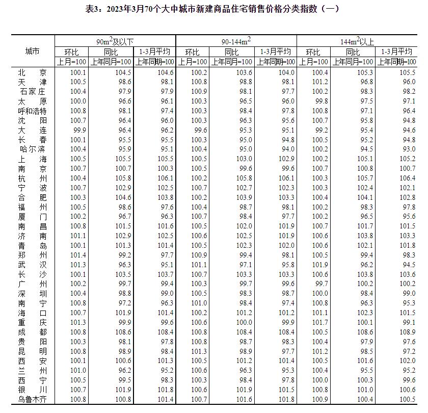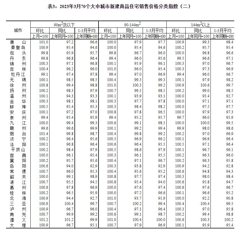 2023年3月份,70个大中城市中商品住宅销售价格上涨城市个数增加,各线城市商品住宅销售价格环比上涨,一线城市商品住宅销售价格同比上涨、二三线城市同比降幅收窄。 一、一二三线城市商品住宅销售价格环比上涨 3月份,70个大中城市中,新建商品住宅和二手住宅销售价格环比上涨城市分别有64个和57个,比上月分别增加9个和17个。 3月份,一线城市新建商品住宅销售价格环比上涨0.3%,涨幅比上月扩大0.1个百分点;二手住宅销售价格环比上涨0.5%,涨幅比上月回落0.2个百分点。二线城市新建商品住宅和二手住宅销售价格环比分别上涨0.6%和0.3%,涨幅比上月均扩大0.2个百分点。三线城市新建商品住宅销售价格环比上涨0.3%,涨幅与上月相同;二手住宅销售价格环比由上月持平转为上涨0.2%。 二、一线城市商品住宅销售价格同比上涨、二三线城市同比降幅收窄 3月份,70个大中城市中,新建商品住宅和二手住宅销售价格同比上涨城市分别有18个和8个,比上月分别增加4个和1个。 3月份,一线城市新建商品住宅销售价格同比上涨1.7%,涨幅与上月相同;二手住宅销售价格同比上涨1.1%,涨幅比上月扩大0.1个百分点。二线城市新建商品住宅和二手住宅销售价格同比分别下降0.2%和2.4%,降幅比上月均收窄0.5个百分点。三线城市新建商品住宅和二手住宅销售价格同比分别下降2.7%和3.9%,降幅比上月分别收窄0.6和0.5个百分点。 注释: 70个大中城市房地产价格统计一二三线城市划分:一线城市指北京、上海、广州、深圳等4个城市;二线城市指天津、石家庄、太原、呼和浩特、沈阳、大连、长春、哈尔滨、南京、杭州、宁波、合肥、福州、厦门、南昌、济南、青岛、郑州、武汉、长沙、南宁、海口、重庆、成都、贵阳、昆明、西安、兰州、西宁、银川、乌鲁木齐等31个城市;三线城市指唐山、秦皇岛、包头、丹东、锦州、吉林、牡丹江、无锡、徐州、扬州、温州、金华、蚌埠、安庆、泉州、九江、赣州、烟台、济宁、洛阳、平顶山、宜昌、襄阳、岳阳、常德、韶关、湛江、惠州、桂林、北海、三亚、泸州、南充、遵义、大理等35个城市。 2023年3月份70个大中城市商品住宅销售价格变动情况 ![]() ![]() ![]() ![]() ![]() ![]() 附注: 1.调查范围:各城市的市辖区,不包括县。 2.调查方法:新建商品住宅销售价格调查为全面调查,基础数据直接采用当地房地产管理部门的网签数据;二手住宅销售价格调查为重点调查和典型调查相结合,基础数据来源于房地产经纪机构上报、相关部门提供和调查员实地采价。 3.价格指数的计算方法详见《房地产价格统计报表制度》。 4.如当月无成交,则视为价格总体水平无变动。 (文章来源:国家统计局) (责任编辑:admin) |