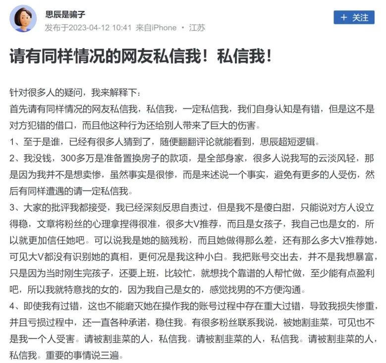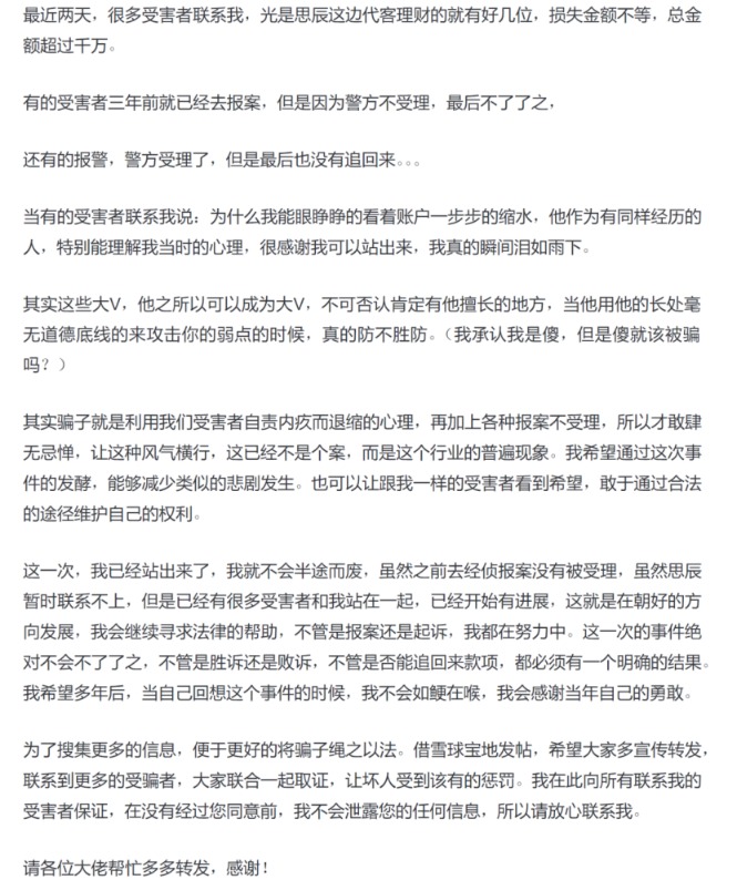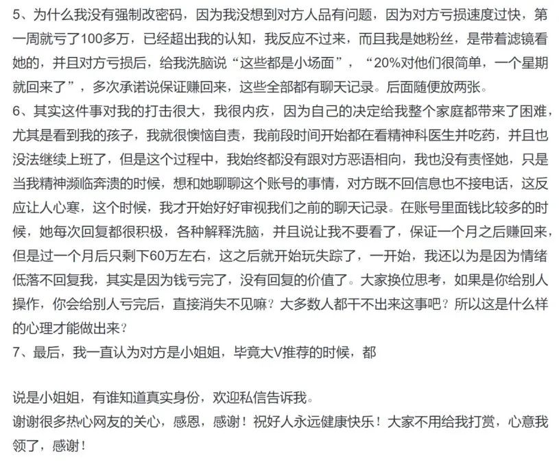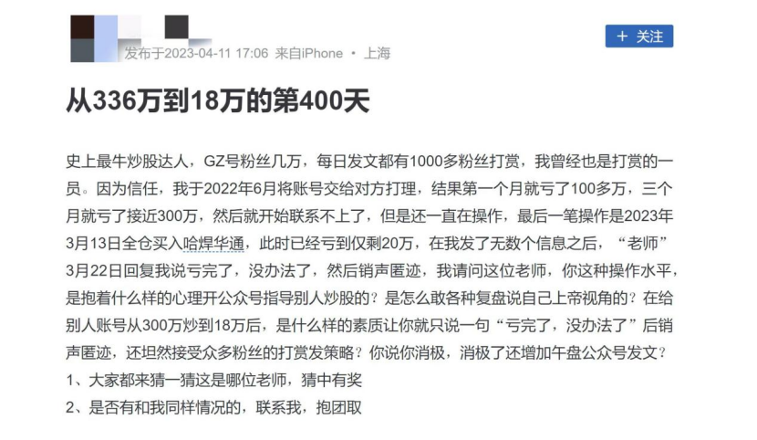 “代客炒股”亏损318万事件持续发酵! 近日,一位用户发帖称,自己将账号交给一位财经大V打理,9个月的时间,从336万大幅缩水至18万,亏损高达95%。该用户称自己向大V发了无数个信息之后,大V却回复他说“亏完了,没办法了”,随后销声匿迹。 随后,该用户表示亏掉自己300多万的财经大V是“思辰超短逻辑”。在最新一篇帖子中,该用户表示最近两天,很多受害者联系自己,光是“思辰”这边代客理财的就有好几位,损失金额不等,总金额超过千万。 目前,“思辰”方并未有任何回应,“思辰超短逻辑”“思辰午盘”两个微博账号已无法查询,两个同名微信公众号也未如期更新文章。另有媒体报道,上述用户表示自己仍未联系上“思辰”。 9个月巨亏95% 近日,一位用户发帖称,自己于2022年6月将账号交给一位财经大V打理,结果第一个月就亏了100多万,三个月就亏了接近300万,9个月的时间,自己的账户从336万大幅缩水至18万,亏损高达95%。 该用户称自己向大V发了无数个信息之后,大V却回复他说“亏完了,没办法了”,随后销声匿迹。 ![]() 根据该用户在帖子中附的截图显示,在短短的76个交易日里,该账户亏损279万,其中股票亏损163万,债券亏损近116万。 ![]() 而到今年4月10日时,该账户合计已亏损317.8万元,其中股票亏损近204万,债券亏损近115万。 ![]() 控诉产业链骗子 在上述帖子引发广泛关注后,该用户又先后发布2篇帖子,表示亏掉自己300多万的财经大V是“思辰超短逻辑”,并将自己的用户名改为“思辰是骗子”。 该用户表示自己是一位宝妈,因为又要带娃又要上班,所以就想找靠谱的人来打理。而亏掉的这300多万是家里准备置换房子的钱,为此她还患上了心理疾病。她之所以曝光这件事情,是希望被骗的人能站出来,跟她一起抱团取暖。 ![]() ![]() 最新一篇帖子中,该用户表示最近两天,很多受害者联系自己,光是“思辰”这边代客理财的就有好几位,损失金额不等,总金额超过千万。 她同时表示会继续寻求法律的帮助。她写道,“不管是报案还是起诉,我都在努力中。这一次的事件绝对不会不了了之,不管是胜诉还是败诉,不管是否能追回来款项,都必须有一个明确的结果。我希望多年后,当自己回想这个事件的时候,我不会如鲠在喉,我会感谢当年自己的勇敢。” ![]() 目前,“思辰”方并未有任何回应,而且,目前“思辰超短逻辑”“思辰午盘”两个微博账号已无法查询,两个同名微信公众号也未如期更新文章。 另有媒体报道,上述用户表示自己仍未联系上“思辰”。 加大力度管理财经大V 近年来,已有多个财经大V因“非法荐股”“代客理财”被封号,监管对此也重拳出击。 中国证监会办公厅2022年12月1日印发了《非法证券活动网上信息内容治理工作方案》,要求通过各地各有关部门共同努力,2023年3月底前,现有网上涉股市“黑嘴”、非法荐股的信息、账号和网站平台得到基本处置。2023年6月底前,证券业务必须持牌经营的要求得到落实,网上证券信息内容明显改善,非法证券活动多发频发态势得到有效遏制。 就在不久之前,证监会公布了一份对大V非法荐股的处罚书。据悉,涉事人是在微博拥有近40万粉丝的网络大V、原上市公司董事易伟。证监会指出,易伟通过微博进行荐股、预测股市行情、宣传并出售投资服务,但其未取得从事证券投资咨询业务的核准,不具备证券投资咨询从业资格及业务资质,共罚没收入近2400万元。 此外,需要注意的是,根据新《证券法》,任何单位和个人不得违反规定,出借自己的证券账户或者借用他人的证券账户从事证券交易。若出借自己的证券账户或者借用他人的证券账户从事证券交易的,责令改正,给予警告,可以处五十万元以下的罚款。 (文章来源:券商中国) (责任编辑:admin) |