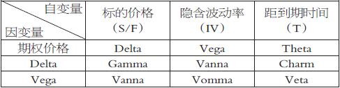 在初次接触希腊值时,我们将一阶希腊值理解为以标的价格、隐含波动率、距到期时间为自变量、以期权价格为因变量的多项式中各个自变量的系数。按照这个思路,自变量保持不变,将因变量换成各个一阶希腊值,这时的自变量系数就变为对应的二阶希腊值。下表列举出常见的3个一阶希腊值与5个二阶希腊值。