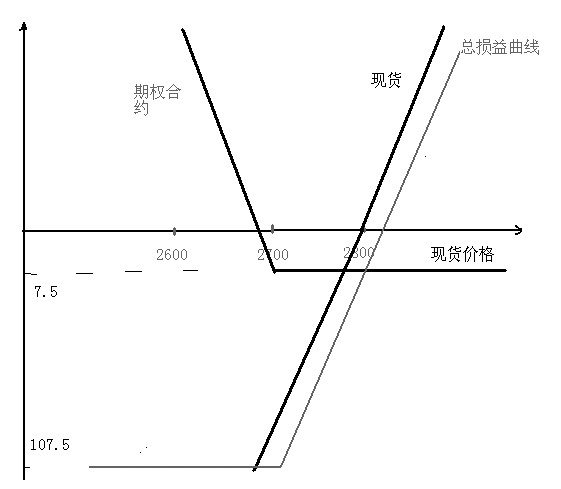 上图是期权套保策略中,期权合约持有到期的损益图。如果在持有期权合约未到期时,即使豆粕期货1801合约价格高于2700元/吨,在到期日足够的情况下,期权m1801—p—2700合约价格应该高于7.5元/吨。若该企业认为豆粕期货价格或将止跌企稳,可以选择平掉期权头寸,获取一定的收益,降低成本。如果后市正如其预期,那么此操作无疑是成功的。如果判断错误,豆粕价格上涨,其最大损失也只有7.5元/吨。如果价格出现大幅下跌,该企业的现货头寸也得到了较好的保护,一举两得。