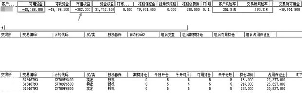 客户全仓卖出深度虚值期权合约,后期行情向其不利方向发展,权利金价格大幅上涨,客户资金权益为31742.7元保持不变,客户风险率为251.81%,交易所风险率为193.71%,但是市值权益已经为-382.3,客户实际已经穿仓。客户的期货持仓账户中无法显示市值权益等其他实时变化情况,风控管理人员要通过风控端时刻关注客户市值权益变化情况,避免因保证金不足导致客户纠纷事件的发生。