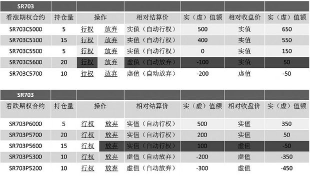 假设T日为白糖期权SR703合约的最后交易日,当日白糖期货SR703的结算价5500元/吨,白糖期货SR703的收盘价为5650元/吨。客户持有以上期权合约,其中SR703—C—5600期权合约盘中为实值期权,实值额为50点,客户期权合约平仓将获得一部分权利金收益。SR703—P—5600期权合约盘中为虚值期权,虚值额为-50点,客户无需准备行权后期货持仓所占用的保证金。期权收盘后由于期权结算价和收盘价偏离的原因,SR703—C—5600期权合约从实值期权转变为虚值期权,虚值额为-100点,系统自动放弃期权持仓行权,导致客户丧失了收盘前平仓收取权利金的权利。SR703—P—5600期权合约收盘后从虚值期权转变为实值期权,实值额为100点,系统将自动申请期权行权,因客户可用资金不足被放弃参与行权,不巧的是,下一交易日期货市场出现了有利于期货持仓方向的大幅下跌行情,客户将主要责任归咎于期货公司未及时通知其补足资金所致,故由此与期货公司发生了纠纷。