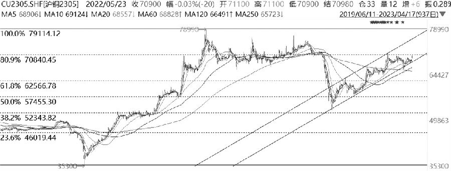 2022年7月中旬,沪铜期货回调至黄金分割0.382对应的52344元/吨支撑位后重新试涨。目前,沪铜期价处于上涨通道之中,临近黄金分割0.809对应的70840元/吨交易密集区,若价格能够向上形成突破,则将检验78990元/吨前高压力。均线方面,均线系统呈现近似多头排列,显示整体走势仍然偏强。指标方面,MACD指标低位金叉,KDJ指标、RSI指标金叉后发散,不过MACD指标出现顶背离的迹象,价格上涨存在隐患。量仓方面,沪铜期价临近70840元/吨之后出现减仓,说明多头在重要压力位主动获利了结,上涨动能开始减弱。操作上,背靠70840元/吨压力位轻仓试空。 螺纹钢 指标金叉