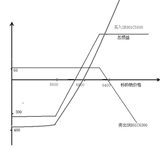 投资者认为白糖期货后市价格上涨的可能性较大,又不愿意承受太大的风险,其选择期权对角牛市套利策略。在具体合约选择上,其选择买入一份SR901C5600期权合约,价格为386.5元/吨,同时卖出一份SR801C6300期权合约,价格为61元/吨,操作计划是:后续选择SR803期权合约、SR805期权合约、SR807期权合约、SR809期权合约、SR811期权合约、SR901期权合约等合约对冲操作。