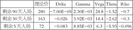 假设入场时标的白糖期货价格为6190元每吨,以当前主力月份白糖期权平值合约隐含波动率11.5%左右进行计算,3个入场点的组合希腊风险指标值结果如下表,为简单起见本文中假设隐含波动率不变: