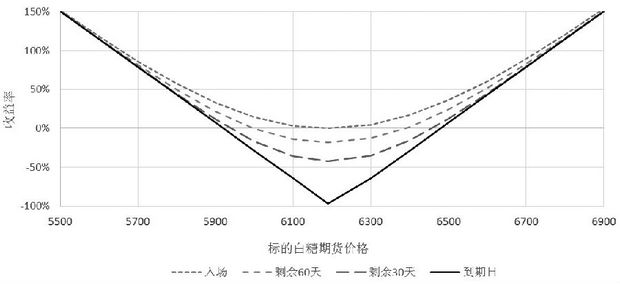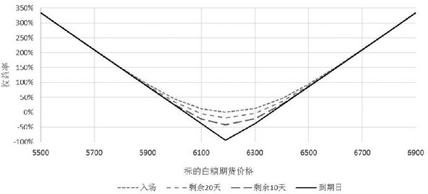 考虑极端的情况,假如在距离到期时间5天入场时入场,期权费相对最低,建仓成本约为每吨72元,刚建仓时每天的时间价值损失约为每吨5.93元。假如行情完全不动,理论上持仓2天后就亏损22%,可见时间价值亏损极快,获利概率较低,但由于成本较低,最大风险有限,如果标的出现大幅波动,也有机会获得较高收益率。