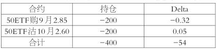 期权Delta衡量标的价格变动所引起的期权价格的变动。从数学意义上来说,它是指期权价格变动与标的价格变动量的比率,或者期权价格对标的价格的偏导数。在风险管理的过程中,Delta便是对方向性敞口的量化分析,具备跨品种和跨周期的可加性。举个例子,9月1日50ETF收于2.760,某投资者构建如下卖出宽跨式组合: