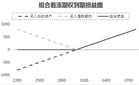 假设豆粕1801期货合约价格为3000元/吨,投资者A和投资者B分别预期豆粕1709期货合约价格将会上涨,但是又担心价格下跌的风险,前者买入平值看涨期权,后者借助平值看跌期权和标的资产构建组合部位,损益情况如下所示:
