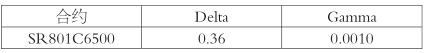 Gamma是期权价格关于标的资产价格变化的二阶导,是期权Delta关于标的资产价格变化的一阶导数。Gamma是对风险管理难度和风险敞口变动速度的数量化衡量。期货和股票等线性资产无Gamma,Delta均为1。举个例子,假设投资者持有SR801C6500,其希腊字母如下所示: