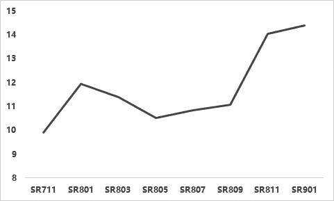 以近月期权的Vega风险为基准进行逐月比较可以发现,SR801期权合约作为主力合约,Vega风险几乎为近月合约的两倍,次主力合约SR805期权合约几乎为近月合约的三倍。进行相应权重调整,方能实现有限风险下的盈利。