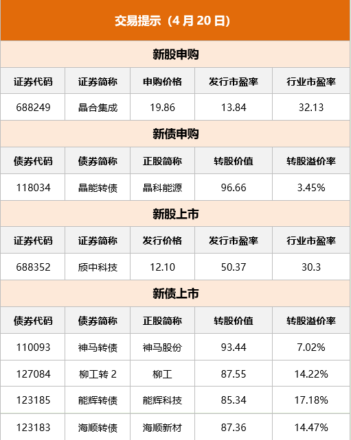 宁德时代:正式发布凝聚态电池,单体能量密度最高可达500Wh/kg,兼具高比能和高安全的特性,并在今年内具备量产能力。宁德时代首席科学家吴凯表示,这是宁德时代在电池上的一个重要巨大突破,凝聚态电池拥有安全性高、可靠性强、循环寿命长等特点,该电池可以快速量产,接下来车规级产品也会推出。 工业富联:关注到网络平台流传关于公司丢失订单的不实报道,上述传闻均为不实传闻。目前公司与现有客户合作均正常开展,订单情况持续稳定,业务均有序正常推进,且不存在应披露而未披露的重大信息。 剑桥科技:目前公司的主营业务是电信宽带、无线网络和小基站、高速光模块和交换机与工业物联网基础硬件。其中,高速光模块业务的营收占比为12.64%,对公司净利润的贡献较小。近期公司的高速光模块业务经营维持平稳,未发生重大变化。 赛微电子:公司持股12.03%的股东国家集成电路基金计划15个交易日后的6个月内,通过集中竞价方式减持公司股份不超过1469.12万股,即不超过公司目前总股本的2%。 天奈科技:公司拟与四川天府新区眉山管委会签订投资协议,投资四川天奈锦城正极材料生产基地项目。项目内容为建设年产10万吨锂离子电池高导电新型正极材料生产基地项目,计划总投资约30亿元。 南网储能:公司与梅州市政府签订《储能产业发展合作共建协议》;全资孙公司南网储能科技与五华县政府签订《招商引资框架协议书》。梅州市各级政府鼓励和支持南网储能在梅州投资建设新型储能电站及产业项目。 华友钴业:公司与LG化学、韩国新万金开发厅、全罗北道及群山市地方政府、韩国农渔村公社签订《投资谅解备忘录》。备忘录约定,公司与LG化学拟在韩国新万金国家产业园区内投资设立电池材料(金属硫酸盐、前驱体)生产工厂。 国科微:公司自研推出的固态存储控制器芯片GK23系列已通过国密国测双重认证并获得市场认可。基于公司自研的固态存储控制器芯片,公司推出31/61系列固态硬盘,产品技术在国内处于领先地位。公司的固态硬盘控制器芯片及整盘方案支持国密算法,在芯片级加密、数据安全、定制化等方面积累了丰富经验。 盘江股份:公司控股子公司新能源关岭公司拟投资建设关岭县盘江百万千瓦级光伏基地一期1050MWp 项目,项目总投资37.88亿元。 抚顺特钢:为扩大高端产品产能,提升绿色发展水平,公司拟2023-2024年度继续投资建设提升产能及产品质量,以及节能环保技术改造项目。项目投资总额预计10.06亿元。其中,2023年度投资总额2.5亿元。 苹果:日前,苹果在官网宣告,其酝酿多时的Apple Card高收益储蓄账户(Savings Account)正式上线,功能上类似国内的“余额宝”。据悉,该账户系苹果与高盛合作推出,提供4.15%的高收益年利率,是美国平均水平的10倍多,听起来非常诱人。 特斯拉:4月19日,特斯拉在美国市场再降价。与此同时,有网传消息称,本周六,中国内地市场特斯拉Model 3、Model Y将迎来降价,其中Model 3最高降4.3万,Model Y系列降4.6万,对此,特斯拉方面回应称,此为假消息。