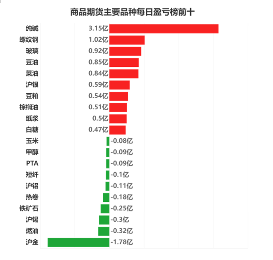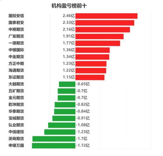 每日市场龙虎榜,带你深度了解市场。 市场一览:周四商品期货综合指数下跌0.89%,日内资金净流出33.42亿元。 市场成交量为3624.17万手,成交额为2.07万亿元。 持仓量为3748.41万手,较前一交易日增加1.02万手。 市场成交量前十和持仓量前十如下图所示: ![]() ![]() 品种盈亏榜:今日商品期货中纯碱盈利第一,为3.15亿元。 沪金亏损第一,为1.78亿元。 ![]() 就纯碱而言,今日席位盈利前三为中泰期货、国泰君安、一德期货,分别盈利12156.49万元、8936.65万元、8391.79万元。 今日席位亏损前三为弘业期货、浙商期货、申银万国,分别亏损10614.11万元、7636.40万元、4589.16万元。 ![]() 就沪金而言,今日席位盈利前三为齐盛期货、中辉期货、五矿期货,分别盈利2807.92万元、1374.15万元、840.17万元。 今日席位亏损前三为华泰期货、中财期货、永安期货,分别亏损7757.65万元、4267.83万元、3097.01万元。 ![]() 席位盈亏榜:今日机构席位中国投安信盈利第一,为2.46亿元。 申银万国亏损第一,为1.72亿元。 ![]() 就国投安信而言,今日品种盈利前三为豆粕、豆油、沪银,分别盈利6311.49万元、5206.84万元、2781.89万元。 今日品种亏损前三为沪深、上证、纯碱,分别亏损2408.11万元、1633.92万元、1475.22万元。 ![]() 就申银万国而言,今日品种盈利前三为PTA、螺纹钢、尿素,分别盈利2261.95万元、2259.90万元、607.53万元。 今日品种亏损前三为中证500股指、纯碱、玻璃,分别亏损7171.41万元、4589.16万元、3273.08万元。 ![]() 注:可通过点击东方财富期货PC端左侧“龙虎榜”栏目及东方财富期货APP行情页面“龙虎榜”栏目查看各类机构持仓及盈亏榜单信息。 ![]() ![]() (文章来源:东方财富研究中心) (责任编辑:admin) |