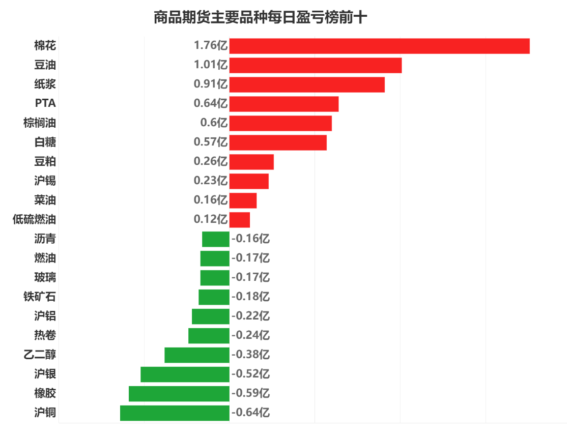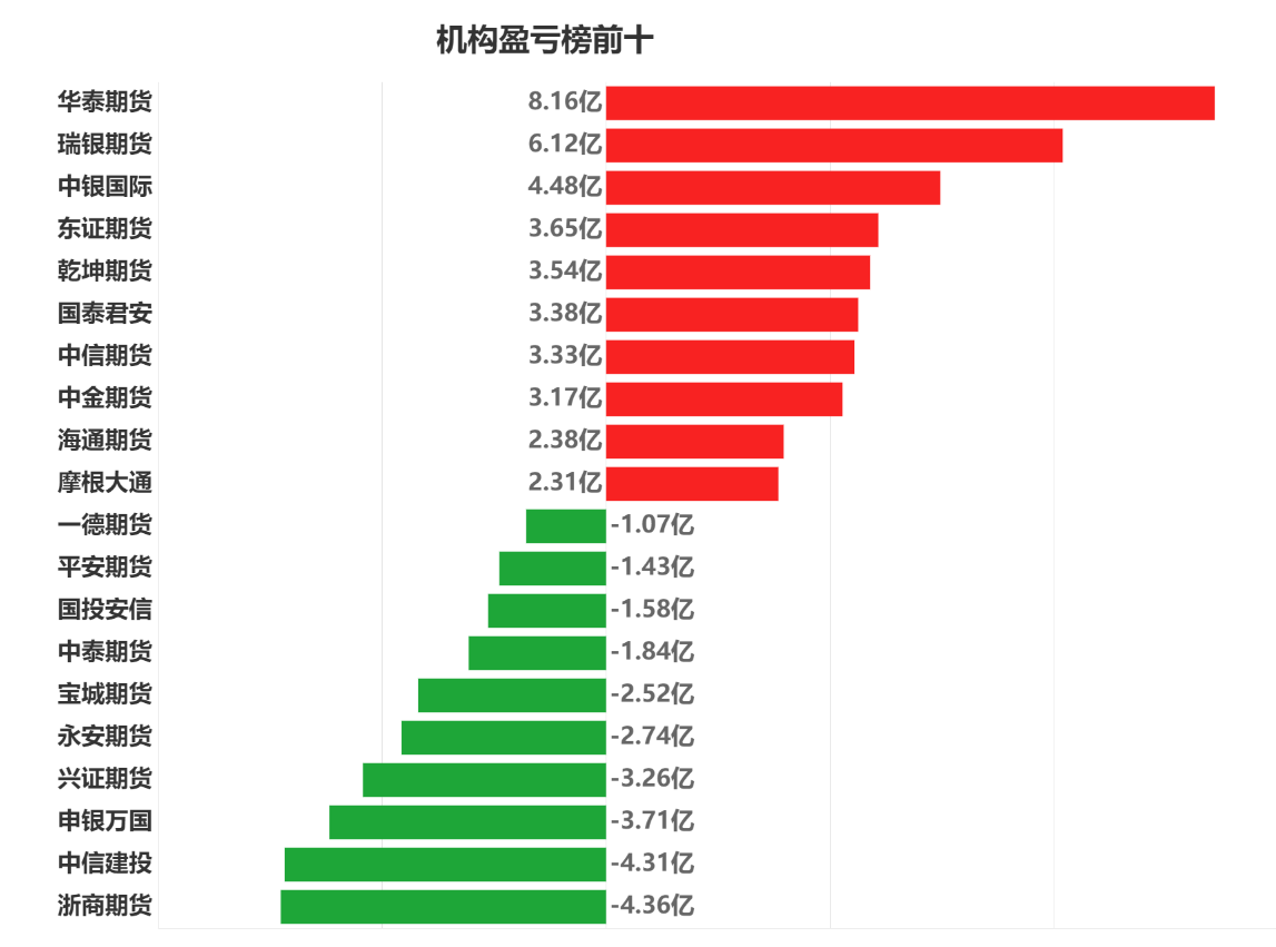 每日市场龙虎榜,带你深度了解市场。 市场一览:周五商品期货综合指数下跌1.13%,日内资金净流出101.14亿元。 市场成交量为3612.10万手,成交额为2.14万亿元。 持仓量为3717.10万手,较前一交易日减少31.31万手。 市场成交量前十和持仓量前十如下图所示: ![]() ![]() ![]() 品种盈亏榜:今日商品期货中棉花盈利第一,为1.76亿元。 沪铜亏损第一,为0.64亿元。 ![]() 就棉花而言,今日席位盈利前三为中国国际、华融融达、首创期货,分别盈利4831.57万元、4792.51万元、4369.72万元。 今日席位亏损前三为华泰期货、东兴期货、国投安信,分别亏损2146.50万元、1439.08万元、1346.01万元。 ![]() 就沪铜而言,今日席位盈利前三为五矿期货、紫金天风、先锋期货,分别盈利4415.31万元、2232.59万元、1572.75万元。 今日席位亏损前三为金瑞期货、建信期货、国泰君安,分别亏损4468.68万元、2543.77万元、2218.65万元。 ![]() 席位盈亏榜:今日机构席位中华泰期货盈利第一,为8.16亿元。 浙商期货亏损第一,为4.36亿元。 ![]() 就华泰期货而言,今日品种盈利前三为中证500股指、沪深、中证1000股指,分别盈利65415.96万元、10703.51万元、7492.21万元。 今日品种亏损前三为上证、沪银、棉花,分别亏损4011.26万元、2643.46万元、2146.50万元。 ![]() 就浙商期货而言,今日品种盈利前三为棕榈油、沪金、焦煤,分别盈利1088.41万元、485.19万元、254.23万元。 今日品种亏损前三为中证500股指、沪深、玻璃,分别亏损12678.63万元、8646.07万元、4206.72万元。 ![]() 注:可通过点击东方财富期货PC端左侧“龙虎榜”栏目及东方财富期货APP行情页面“龙虎榜”栏目查看各类机构持仓及盈亏榜单信息。 ![]() ![]() (文章来源:东方财富研究中心) (责任编辑:admin) |