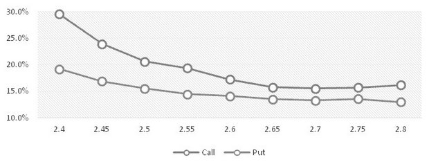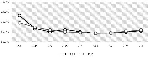 上文提到价差是取舍名义标的物与实际标的物的主要评判标准,那么价差的存在究竟对期权交易有怎样的影响呢?最直观的影响就是扭曲期权IV(隐含波动率)。