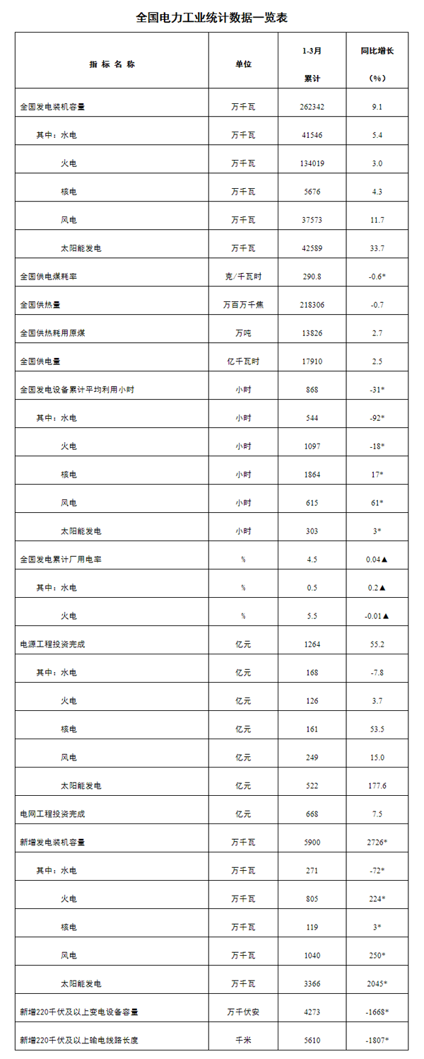 4月23日,国家能源局发布1-3月份全国电力工业统计数据。 截至3月底,全国累计发电装机容量约26.2亿千瓦,同比增长9.1%。其中,风电装机容量约3.8亿千瓦,同比增长11.7%;太阳能发电装机容量约4.3亿千瓦,同比增长33.7%。 1-3月份,全国发电设备累计平均利用868小时,比上年同期减少31小时。其中,水电544小时,比上年同期减少92小时;火电1097小时,比上年同期减少18小时;风电615小时,比上年同期增加61小时;核电1864小时,比上年同期增加17小时;太阳能发电303小时,比上年同期增加3小时。 1-3月份,全国主要发电企业电源工程完成投资1264亿元,同比增长55.2%。其中,太阳能发电522亿元,同比增长177.6%;核电161亿元,同比增长53.5%。电网工程完成投资668亿元,同比增长7.5%。