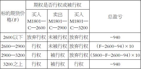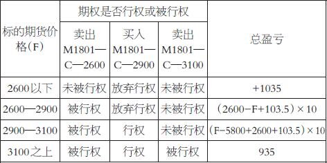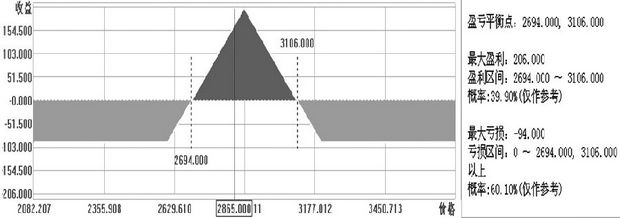 某机构投资者通过分析豆粕市场,认为美国大豆进入成熟期,在收获前影响因素不会有太大的变化,即导致豆粕价格大幅波动的事件属于小概率,判断后市豆粕价格或将围绕2900点一线振荡,局部因素可能导致波动幅度超过180点,因此其决定在豆粕期权市场上进行蝶式期权策略操作。具体而言,该投资者,以317.5元/吨的价格买入1手M1801—C—2600合约,以66.5元/吨的价格买入1手M1801—C—3200合约,以145元/吨的价格卖出2手M1801—C—2900合约,同时下单并成交。该机构投资者的资金使用,除结算保证金之外,其支出成本为23.5元/吨(317.5+66.5-145×2=94元,94/4=23.5元),合计支出保证金940元。不计算资金使用成本和交易佣金,本策略最大风险为940元(净支付的保证金),最大的盈利为2060元(期权到期时,豆粕期货1801合约价格为2900元/吨,买入看涨M1801—C—2600期权合约行权,其他合约放弃行权和被行权,此时盈利最大,总收益为(2900-2600-94)×10=2060元)。该策略的盈亏平衡点分别是到期日豆粕期货1801合约价格为2694或3016,在【2694,3016】之间就会盈利,在这个价格之外,就会出现亏损。