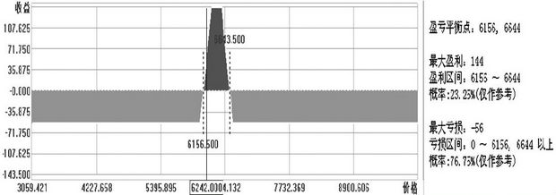 经计算,该策略最大的风险为560元(285+65-186.5-107.5=56,56×10=560),最大盈利为1440(白糖期货1801合约价格在6300—6500,此时SR801C6100行权,SR801C6300被行权,SR801C6500未被行权,SR801C6700放弃行权,结果为6300-6100-56=144,144×10=1440)。