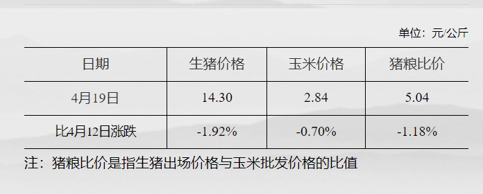 发改委:猪粮比价为5.04 比4月12日下跌1.18% 发改委 04月24日 据国家发改委数据,截至4月19日,全国生猪出场价格为14.30元/公斤,比4月12日下跌1.92%;主要批发市场玉米价格为2.84元/公斤,比4月12日下跌0.70%;猪粮比价为5.04,比4月12日下跌1.18%。(文章来源:发改委) (责任编辑:admin)