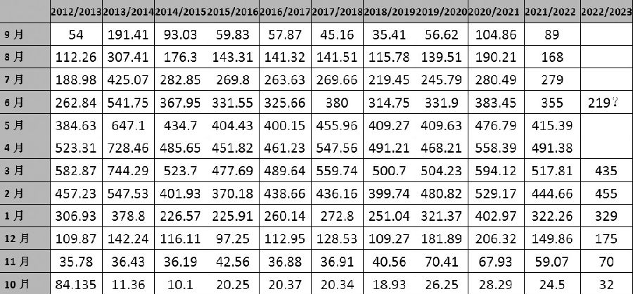 表为各榨季工业库存对比(单位:万吨)