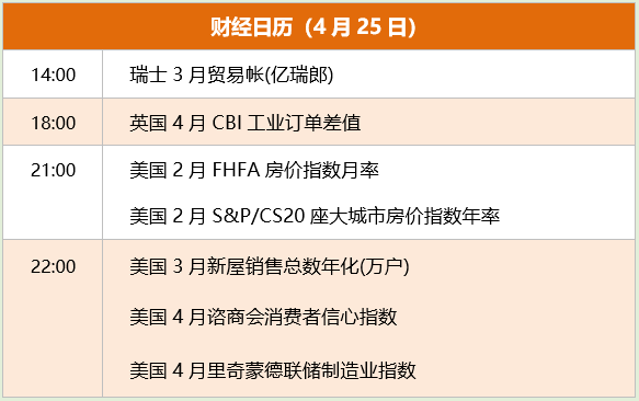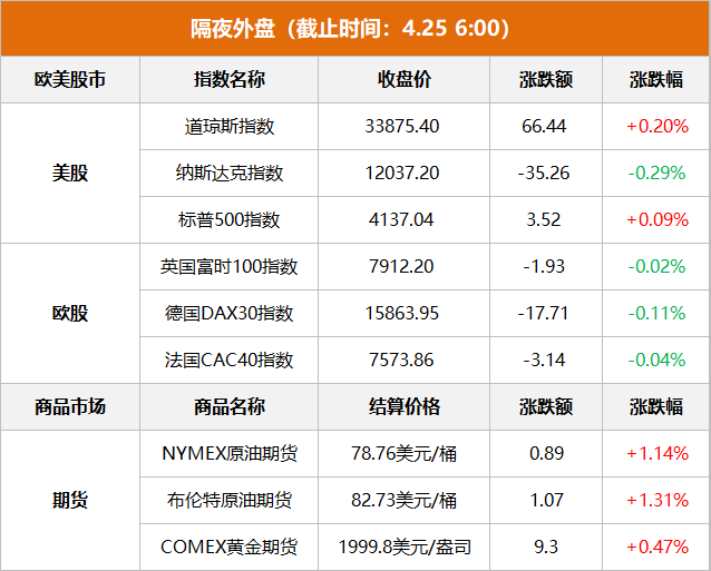 美股:道指收涨0.20%,报33875.40点;纳指收跌0.29%,报12037.20点;标普500指数收涨0.09%,报4137.04点。 欧股:德国DAX 30指数收跌0.11%,报15863.95点。法国CAC 40指数收跌0.04%,报7573.86点。英国富时100指数收跌0.02%,报7912.20点。 亚太股市:4月24日,香港恒生指数收跌0.58%,报19959.94点;恒生科技指数收跌0.22%,报3961.17点。日经225指数收涨0.04%,报28577.00点。韩国KOSPI指数收跌0.82%,报2523.63点。 人民币:在岸人民币兑美元北京时间03:00收报6.8947,较上一交易日夜盘收盘跌17点。成交量434.95亿美元。 黄金:COMEX 6月黄金期货收涨0.47%,报1999.8美元/盎司。 原油:WTI 原油期货收涨1.14%,报78.76美元/桶;布伦特原油期货收涨1.31%,报82.73美元/桶。 财联社:白宫官员周一对媒体表示,美国总统拜登将否决国会推翻他对四个东南亚国家豁免两年太阳能关税政策的努力。去年6月,拜登免除了对柬埔寨、马来西亚、泰国和越南的太阳能电池板征收的关税,试图在美国制造业加速发展之际架起一座“桥梁”。上周,美国众议院一个委员会投票赞成恢复对这四个国家的太阳能电池板征收关税,扭转了对拜登的豁免关税政策。 智利总统博里奇:智利希望在未来生产锂电池;现在,我们将针对智利矿产开采许可法递交新的修订建议。 财联社:美国提议七国集团(G7)对俄罗斯实施全面的出口禁令,其中只有少数得到豁免,豁免对象将包括农业、医疗和其他产品。但据三名知情人士透露,日本和欧盟在上周的一次筹备会议上表示,此举不可行。 第一财经:据报道,美国众议院议长麦卡锡以及他的计票副手告诉共和党同僚,他们不会修改1.5万亿美元的债务上限提案,尽管党内基层要求做出改变。知情人士透露,他们计划根据不允许修改的规则本周晚些时候将该提案原封不动提交众议院全院表决。 欧洲央行执委施纳贝尔:不排除欧洲央行下周加息50个基点的可能性;最终加息幅度要取决于经济数据;到目前为止的数据显示通胀高于预期;央行须看到核心通胀持续放缓;迄今发布的经济数据显示出经济比预想的更具韧性;看到加息对经济产生影响的初步迹象。 财联社:自上月银行业混乱以来,美国股市近日一直出奇地平静。但瑞银警告称,在银行业动荡和美股财报季的影响下,信贷紧缩和财报盈利下滑可能会让美股市场再度陷入波动。在金融环境收紧、企业盈利下降和估值相对较高的背景下,美国股市的前景受到挑战。