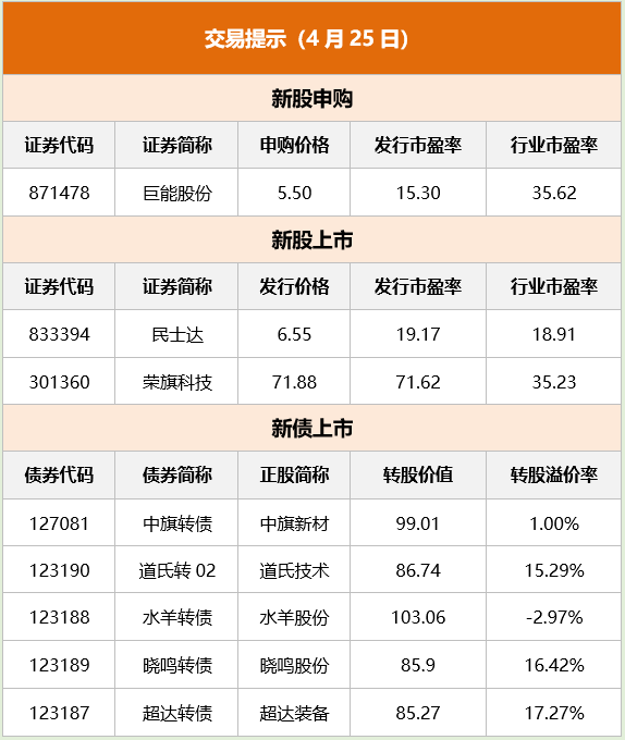 央行:发布2023年一季度小额贷款公司统计数据报告。数据显示,截至2023年3月末,全国共有小额贷款公司5801家。贷款余额8722亿元,一季度减少385亿元。 人社部:举行新闻发布会,介绍2023年一季度人力资源和社会保障工作进展情况,并答记者问。相关负责人指出,一季度人力资源和社会保障工作取得积极进展。1-3月城镇新增就业297万人,3月份全国城镇调查失业率5.3%,3月底脱贫人口务工规模3074万人,就业局势保持总体稳定。 能源局:公布《关于加强新型电力系统稳定工作的指导意见(征求意见稿)》。文件指出,进一步加强稳定工作是构建新型电力系统的必然要求。《征求意见稿》提及,未来相当长时间内,电力系统仍将维持以交流电为基础的技术形态,交流电力系统稳定问题将长期存在。 财联社:央行24日开展1150亿元7天期逆回购操作,为4月以来首次突破千亿规模操作量。因有200亿元7天期逆回购到期,当日实现净投放950亿元,也创下4月以来新高。市场人士表示,由于跨月流动性仍偏紧,近几日央行加大公开市场逆回购投放力度,有助于缓解月末的资金紧张程度,且预计本周或维持较高规模的操作量。 上海证券报:截至3月底,基本养老保险基金投资运营规模超过1.65万亿元。截至去年底,全国职业年金基金投资运营规模超过2.11万亿元,年均投资收益率5.29%。人力资源社会保障部表示,下一步将加强基金监督管理,部署开展社会保险基金管理巩固提升行动,持续推动扩大企业职工基本养老保险基金委托投资规模。 中国证券报:瑞银亚洲经济研究主管及首席中国经济学家汪涛发布报告预计,未来中国CPI疲弱和PPI下跌的情况将会逐渐改善,中国经济并不存在系统性和可持续的通缩压力。中国CPI同比增速可能在下半年回升至2.5%以上,全年平均增长2%左右。 上证报:今年以来,各方协同发力,扩大新基建有效投资的步伐加快。发改委、工信部、国资委等部门频频助力新基建,上海、北京、广东、陕西、湖南等地方政府也积极行动加快新基建项目落地。各部门、各地方都在部署新型基础设施建设工作,已形成了经济社会发展的关键新动能。 中证报:美元定期存款业务较此前有所收缩,部分银行采取降低美元存款利率、减少产品期限种类等措施。业内人士分析,美联储加息周期或进入尾声,国内美元定存产品利率上行空间受限,建议投资者购买相关产品时应充分考虑购汇成本、汇率波动等因素。 央视新闻:中国工程院院士、中国探月工程总设计师吴伟仁表示,嫦娥七号任务只是后续探月四期任务中的一步,未来它将和嫦娥八号组成国际月球科研站的基本型,计划在2030年前建成。2030年之前,中国人的脚印肯定会踏在月球上去,这没问题的。 财联社:《通胀削减法案》是美国总统拜登任期内的标志性政绩之一,尽管该法案的目的之一便是缓解美国国内的通胀,但从美国银行到贝莱德,众多经济学家都认为,这项法案无法做到的恰恰是降低通胀。 Shibor:4月24日,隔夜shibor报1.5990%,下跌20.7个基点;7天shibor报2.1170%,上涨2.1个基点;3个月shibor报2.4300%,上涨0.1个基点。