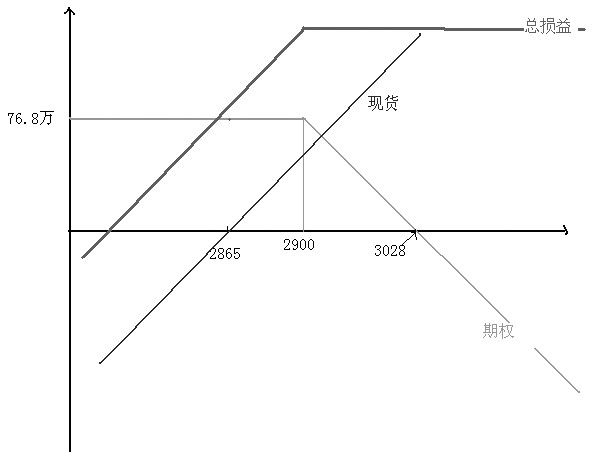 2017年7月7日,某大型贸易商现有10000吨的豆粕库存,买方提货时间在2017年11月。该贸易商有自己的研究分析团队,经过周密分析,认为近期豆粕期货价格将在2830—2910元/吨波动,不会有太大的变化。为降低部分仓储成本,其决定卖出期权合约,获取相应的权利金。当天,其在期权市场卖出看涨期权M—1801—C—2900合约600手,期权成交价格为128元/吨,共收取权利金76.8万元,此时期货市场价格2865元/吨,现货市场为2860元左右,其期权持有时间为45天。期权是存在期限的,随着时间的流逝,时间价值不断减少,期权价格不断下降,同时由于豆粕现货和期货价格变化不大,期权内在价值也不会发生变化。贸易商通过实施该策略,赚取期权时间价值,弥补豆粕的存储成本,该贸易商损益表如图2所示。