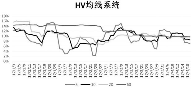 (3)根据波动率的自相关性与群聚性,通过HV均线系统判断HV未来走势。分别选取5日HV与60日HV作为参考依据,4月17日5日HV下穿60日HV,并继续下行,判断HV现处于下行趋势,预计将继续下行。根据IV与HV的相关性,进而判断IV可能会下行。