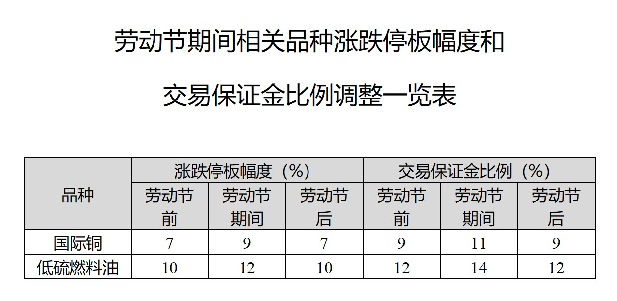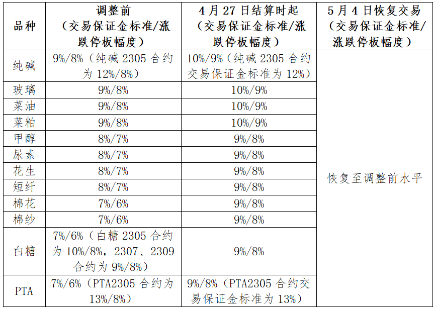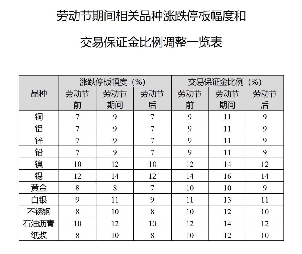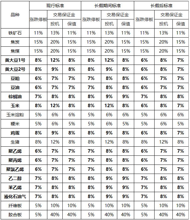 劳动节假期将至,根据各大期货交易所公告,2023年假期期货市场交易时间调整如下: 4月28日(星期五)晚上不进行夜盘交易,4月29日(星期六)至5月3日(星期三)休市,5月4日(星期四)所有合约集合竞价时间为上午08:55—09:00,当晚恢复夜盘交易。 假期前后,部分期货品种交易涨跌幅及保证金标准有所调整,具体如下。 上期所2023年4月27日(星期四)起第一个未出现单边市的交易日收盘结算时,交易保证金比例和涨跌停板幅度调整如下: 铜、铝、锌、铅期货合约的交易保证金比例调整为11%,涨跌停板幅度调整为9%; 不锈钢、纸浆期货合约的交易保证金比例调整为12%,涨跌停板幅度调整为10%; 白银期货合约的交易保证金比例调整为13%,涨跌停板幅度调整为11%; 镍、石油、沥青期货合约的交易保证金比例调整为14%,涨跌停板幅度调整为12%; 锡期货合约的交易保证金比例调整为16%,涨跌停板幅度调整为14%; 如遇上述交易保证金比例、涨跌停板幅度与执行的交易保证金比例、涨跌停板幅度不同时,则按两者中比例高、幅度大的执行。 2023年5月4日(星期四)交易后,自第一个未出现单边市的交易日收盘结算时,交易保证金比例和涨跌停板幅度调整如下: 黄金期货合约的交易保证金比例调整为9%,涨跌停板幅度调整为7%; 其他品种期货合约的交易保证金比例和涨跌停板幅度恢复至原有水平。 ![]() 上海国际能源交易中心自2023年4月27日(星期四)起第一个未出现单边市的交易日收盘结算时,交易保证金比例和涨跌停板幅度调整如下: 国际铜期货合约的交易保证金比例调整为11%,涨跌停板幅度调整为9%; 低硫燃料油期货合约的交易保证金比例调整为14%,涨跌停板幅度调整为12%; 如遇上述交易保证金比例、涨跌停板幅度与执行的交易保证金比例、涨跌停板幅度不同时,则按两者中比例高、幅度大的执行。 2023年5月4日(星期四)交易后,自第一个未出现单边市的交易日收盘结算时,交易保证金比例和涨跌停板幅度调整如下: 所有品种期货合约的交易保证金比例和涨跌停板幅度恢复至原有水平。 ![]() 郑商所自2023年4月27日结算时起: 菜粕、菜油、玻璃、纯碱期货合约的交易保证金标准调整为10%,涨跌停板幅度调整为9%,其中纯碱2305合约的交易保证金标准仍为12%; 白糖、棉花、棉纱、花生、PTA、甲醇、尿素、短纤期货合约的交易保证金标准调整为9%,涨跌停板幅度调整为8%,其中PTA2305合约的交易保证金标准仍为13%。 2023年5月4日恢复交易后: 自品种持仓量最大的合约未出现涨跌停板单边市的第一个交易日结算时起,上述品种期货合约的交易保证金标准和涨跌停板幅度恢复至调整前水平。 按规则规定执行的交易保证金标准和涨跌停板幅度高于上述标准的,仍按原规定执行。 ![]() 广期所自2023年4月27日(星期四)结算时起: 工业硅期货合约涨跌停板幅度和交易保证金标准调整为9%和11%。 2023年5月4日(星期四)恢复交易后,在工业硅品种持仓量最大的合约未出现涨跌停板单边无连续报价的第一个交易日结算时起: 工业硅期货合约涨跌停板幅度和交易保证金标准调整为7%和9%。 大商所自2023年4月27日(星期四)结算时起: 豆粕、豆油、聚乙烯、聚丙烯和聚氯乙烯期货合约涨跌停板幅度调整为7%,交易保证金水平调整为8%; 棕榈油、乙二醇、苯乙烯和液化石油气期货合约涨跌停板幅度调整为8%,交易保证金水平调整为9%; 其他期货合约涨跌停板幅度和交易保证金水平维持不变。 2023年5月4日(星期四)恢复交易后,在各期货持仓量最大的合约未出现涨跌停板单边无连续报价的第一个交易日结算时起,做如下调整: 黄大豆1号、黄大豆2号、玉米和鸡蛋期货合约涨跌停板幅度调整为6%,套期保值交易保证金水平调整为7%,投机交易保证金水平调整为8%; 豆粕、豆油、棕榈油、聚乙烯、聚丙烯、聚氯乙烯、乙二醇、苯乙烯和液化石油气期货合约涨跌停板幅度和交易保证金水平恢复至节前标准; 其他期货合约涨跌停板幅度和交易保证金水平维持不变。 自2023年4月28日(星期五)结算时起,我所将增加生猪期货合约参与组合保证金优惠。 ![]() 中金所自2023年4月27日(星期四)结算时起: 沪深300、上证50、中证500股指期货各合约的交易保证金标准分别调整为13%、13%、15%。 2023年5月4日(星期四)交易后,自相关品种持仓量最大的合约未出现单边市的第一个交易日结算时起: 沪深300、上证50、中证500、中证1000股指期货各合约的交易保证金标准调整为12%。 沪深300、上证50、中证1000股指期权各合约的保证金调整系数根据相应股指期货的交易保证金标准进行调整。 ![]() (文章来源:东方财富研究中心) (责任编辑:admin) |