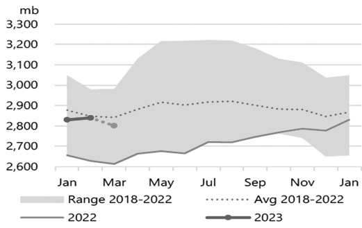 图为OPEC原油产量 供需平衡 OPEC月报预计2023年Call>[IEA月报] 库存水平 2月全球石油库存维持稳定,其中中国的库存下降了950万桶,非经合组织国家的库存下降了210万桶,经合组织的总库存增加了880万桶至4060万桶,为10个月来的最高水平。主要原因是石油需求疲弱,以及欧盟在俄罗斯石油禁运前补充了大量库存。2月,经合组织商业石油库存增加了960万桶至28.4亿桶。