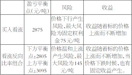 以看涨反向比率组合为例,假设当豆粕期货价格为2800元/吨时,投资者预期价格将长期上涨,于是构造了以下两种投资方案:一是买入看涨期权:买入一手M1709-C-2800,付出权利金75元/吨。二是构建看涨反向比率组合:卖出一手M1709-C-2800,得到权利金75元/吨;同时买入两手M1709-C-2950,付出权利金35元/吨,最终得到净权利金为5元/吨。