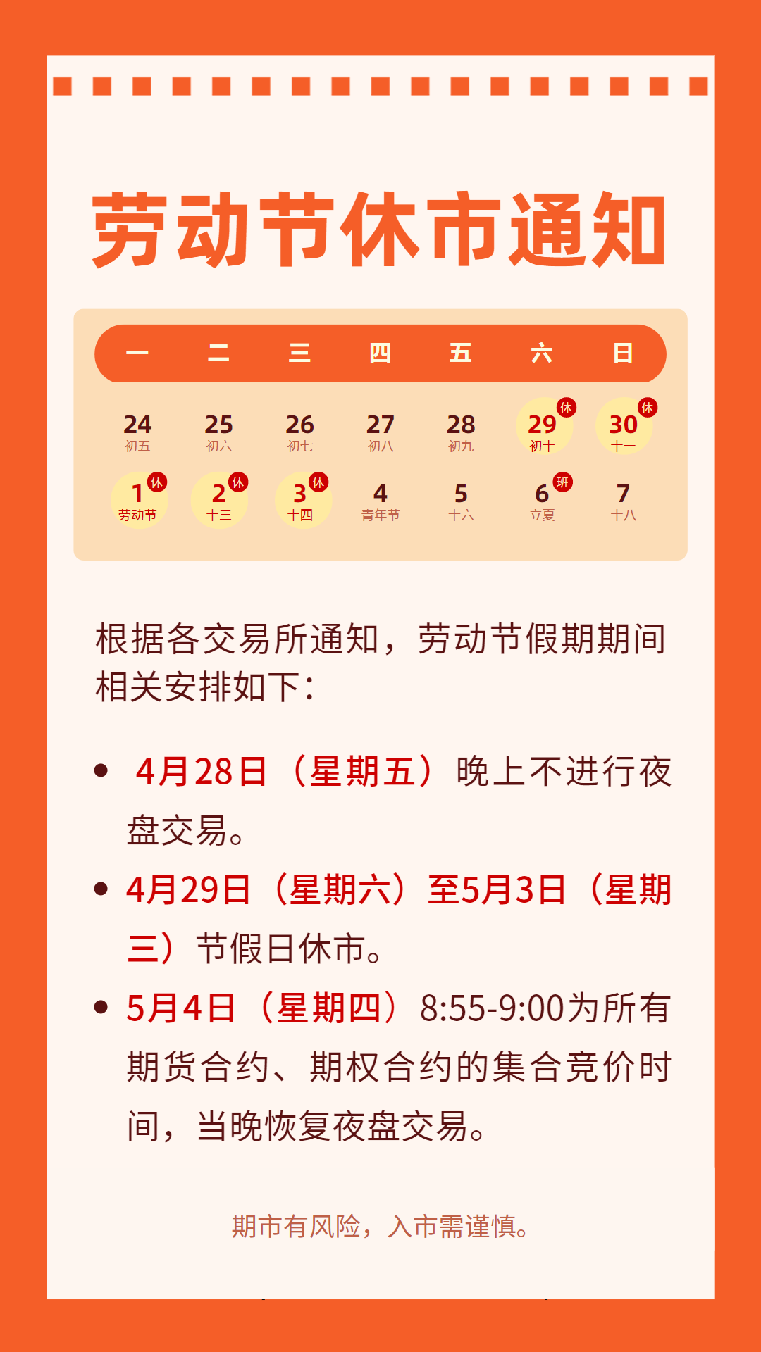 国内期货市场休市安排劳动节假期将至,根据各大期货交易所公告,2023年假期期货市场交易时间调整如下: 4月28日(星期五)晚上不进行夜盘交易,4月29日(星期六)至5月3日(星期三)休市,5月4日(星期四)所有合约集合竞价时间为上午08:55—09:00,当晚恢复夜盘交易。 ![]() 假期风险提示国内期货市场与国际期货市场密切联动,国内“五一”劳动节假期期间,外盘仍在交易。从当前国际宏观经济形势来看,国内外经济增长势头分化,欧美发达经济体经济增长明显减速,叠加欧美商业银行危机和美国债务上限问题,海外金融市场存在较大的剧烈波动风险,此外,国内疫情担忧也有所升温,市场可能存在较大波动。为了控制期货交易风险,投资者在节假日,应提前做好仓位和资金安排,建议轻仓或空仓过节。 附:历年五一节后首日国内期货涨跌情况 交易所调保安排假期前后,部分期货品种交易涨跌幅及保证金标准有所调整,具体如下。(更多内容详见各期货交易所网站相关通知) ![]() ![]() 附:劳动节假期各大期货交易所保证金标准调整情况 重要财经数据事件提示![]() (文章来源:东方财富研究中心) (责任编辑:admin) |
