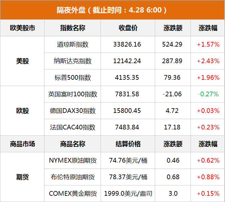 美股:标普500指数收涨79.36点,涨幅1.96%,报4135.35点。道指收涨524.29点,涨幅1.57%,报33826.16点。纳指收涨287.89点,涨幅2.43%,报12142.24点。 欧股:德国DAX 30指数收涨0.03%,报15800.45点。法国CAC 40指数收涨0.23%,报7483.84点。英国富时100指数收跌0.27%,报7831.58点。 亚太股市:4月27日,香港恒生指数收涨0.42%,报19840.28点;恒生科技指数收跌0.26%,报3861.98点。日经225指数收涨0.10%,报28444.50点。韩国KOSPI指数收涨0.45%,报2495.89点。 人民币:在岸人民币兑美元北京时间03:00收报6.9203,较上一交易日夜盘收盘涨67点。成交量463.59亿美元。 黄金:COMEX 6月黄金期货收涨0.15%,报1999.0美元/盎司。 原油:WTI 6月原油期货收涨0.46美元,涨幅0.62%,报74.76美元/桶。布伦特6月原油期货收涨0.68美元,涨幅0.87%,报78.37美元/桶。 共同社:2025大阪关西世博会门票基本价格定为成人每张8000日元(约合人民币410元)左右,已就此展开协调。票价与去年讨论的6000日元相比有所提高,以应对物价上涨和加强保安工作导致的人工费增加。力争在开幕倒计时500天的11月30日开售门票。 央视新闻:进入2023年,多国“去美元化”的进程进入快车道。1月,沙特愿意考虑以非美元货币结算石油贸易。3月,巴西中央银行宣布,人民币已超过欧元,成为该国第二大国际储备货币。4月1日,印度和马来西亚同意用印度卢比进行贸易结算。4月26日,阿根廷宣布将停止使用美元来支付从中国进口的商品,转而使用人民币结算。面对多国纷纷逃离美元的局面,美国经济学家约翰·卡尼警告说,美元可能很快失去其“力量”,美元的主导地位正渐行渐远。 环球网:今年3月,人民币在中国跨境交易中的使用首次超过美元,中国减少对美元依赖的努力又跨过一个里程碑。彭博信息研究公司根据中国国家外汇管理局数据进行的研究显示,人民币在中国跨境收支中所占份额从2010年的接近零上升至今年3月底创纪录的48%。数据显示,同期,美元所占份额从83%降至47%。这一比例是基于所有类型交易的交易量计算的,包括通过中国内地与香港资本市场之间的交易渠道开展的证券交易。 西南证券:当前人民币国际化面临比较好的机遇,主要是因为海外不确定性因素增多后,中国经济在经历疫情冲击后复苏,受到外资中长期看好,人民币汇率有望保持相对稳定。但是由于我国国力相距美国差距仍大,急于挑战美元的国际地位并不现实,人民币国际化仍有很长的路要走,大致将遵循“周边化-区域化-国际化”的路径,近期的事件主要体现出人民币在“区域化”这一阶段的进程有所加速。 银河证券:人民币国际化的路径越来越清晰。目前看,大宗商品计价、双边贸易本币结算,以及新型跨境支付系统可能是发展的重点路径。可以从跨境收支功能、储备功能和投融资功能三项指标来分析人民币国际化的程度。目前人民币在全球贸易结算、储备、投融资领域所占比例仍然有限,但成长速度明显。关于人民币国际化的未来空间,首先国家综合实力是最终的决定因素,以中国为代表的新兴经济体发展最终会推动国际货币多元化。其次,世界数字技术的快速进步,也是打破单极格局的新生力量。最后国际货币也都会受到国际收支平衡的约束。