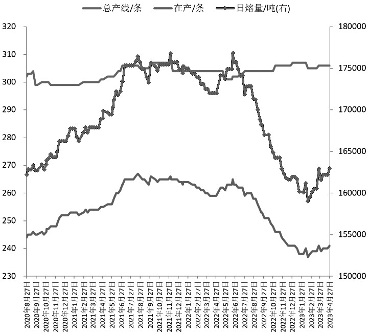 在供应高企、运输不畅和需求受限等因素作用下,2022年6月之后玻璃行业连续9个月深度亏损,行业平均亏损一度高达300元/吨。在持续亏损的重压下,窑炉到期产品竞争力下降的生产线积极放水冷修,非优势产区部分生产线主动退出,行业产能深度去化。据资讯公司数据,在产玻璃产线日熔量从2022年6月中旬的176825吨一路下滑至2023年2月中旬的159030吨,区间玻璃原片供应能力最大降幅10.06%。国家统计局数据显示,我国一季度平板玻璃累计产量为23260万重量箱,同比下降8%。