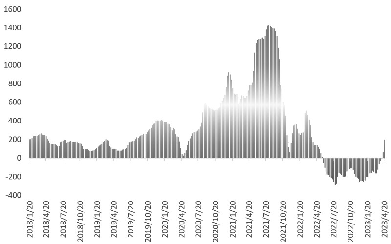 图为近年来浮法玻璃生产线产能变化情况 同时,玻璃需求在2023年呈现出超预期的快速好转。国家统计局数据显示,1—3月房屋竣工累计面积1.94亿平方米,同比增长14.7%,竣工面积同比大幅度增加,其中3月房屋竣工面积6244万平方米,同比增长32.04%。2023年以来,新建住房竣工面积较2022年同期明显大幅度提升,充分反映出金融等多方面政策性措施效果显著。在新建住宅对玻璃需求加速释放的同时,家装玻璃需求显著超预期,系统门窗、室内隔断、玻璃淋浴房等与更新居住环境相关的需求进入2023年后放量并表现出较强的韧性。 供应下降、需求增加的共同作用下,玻璃生产企业库存自3月初起从仅次于2020年同期的历史高位连续10周深度去化,目前主要调出地之一的河北玻璃企业库存水平已降至仅高于2021年历史同期偏低水平,主要调出地之一的湖北玻璃库存已连续4周处于历史同期新低水平。 3月之前玻璃产业链上下游对房地产市场及玻璃需求前景判断相对悲观,在高库存压力下企业以低于成本的价格销售玻璃,避免库存再度累积使生产资金被进一步占用。3月起生产企业库存连续去化极大改变了玻璃企业的经营环境,库存偏低的湖北地区玻璃出厂价首先止跌回升,随后价格涨势向华东传导,进而影响华北市场和华南市场,再进一步扩散到整个国内市场,4月份全国玻璃价格整体上涨的态势得到巩固。国内玻璃产业于4月中旬扭亏为盈,生产毛利在4月末进一步扩大到300元/吨以上。
